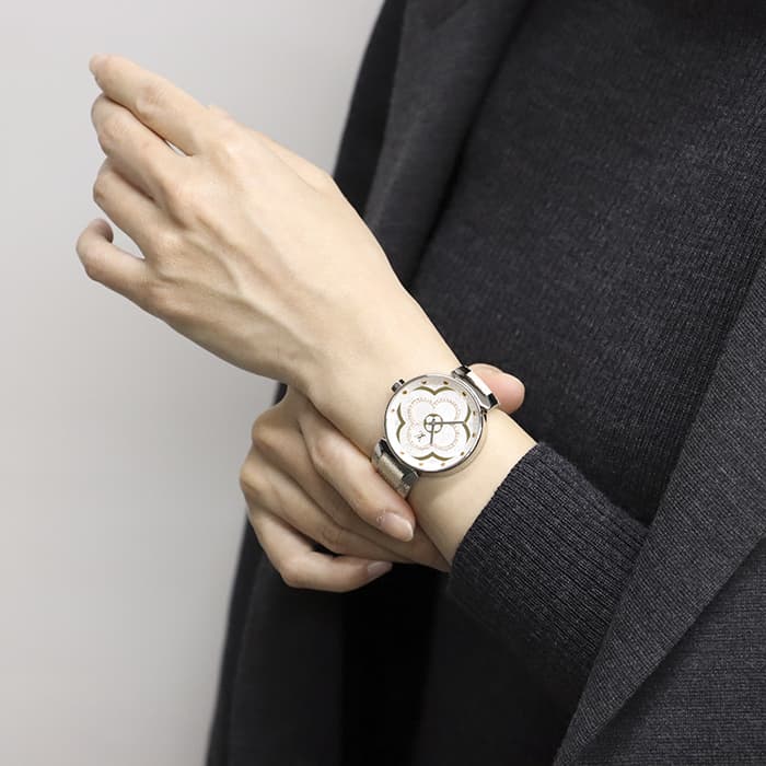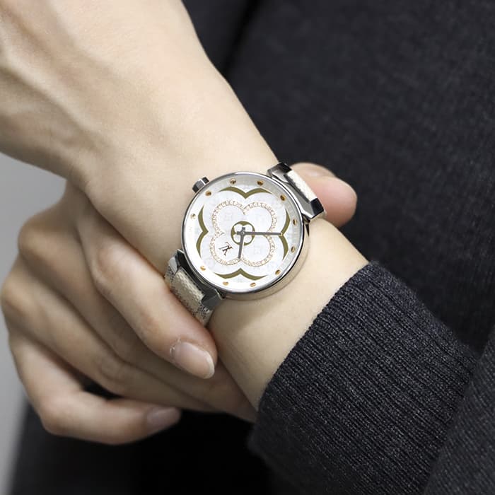 ダイアルは可愛らしい印象が強いですが、ルイヴィトン純正のベルトは優しい色味と落ち着いたデザインを持つため、バランスが取れています。