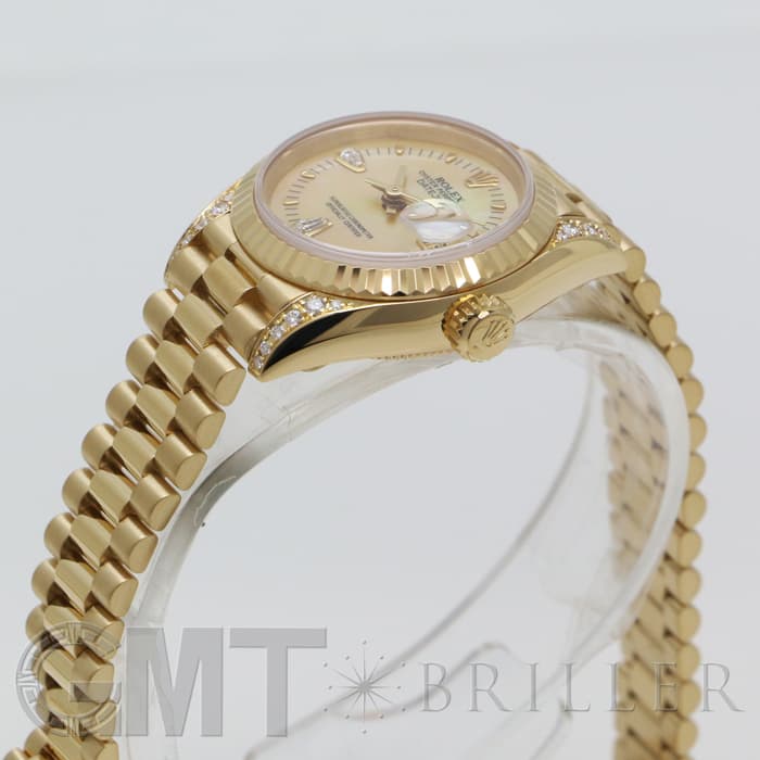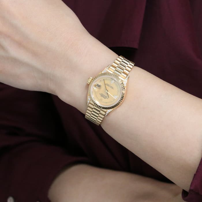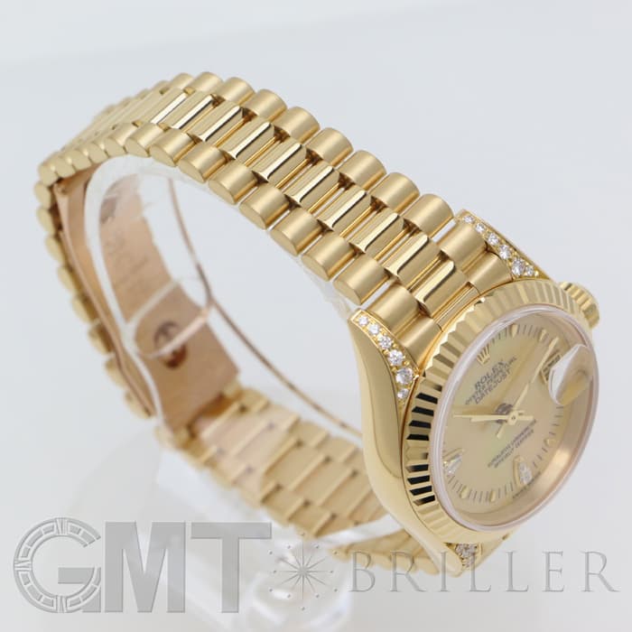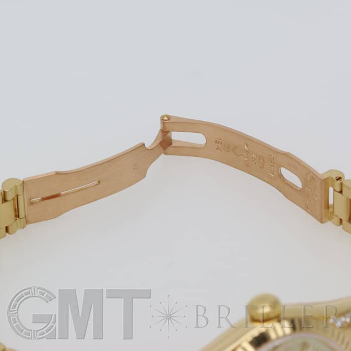 文字盤は貝殻を使用したシェル、ラグと6時、9時インデックスにはティアドロップのダイアモンドがセッティングされた珍しいデザインです。 ブレスレットは1956年 当時のアメリカ大統領に送られたことから名づけられた「プレジデントブレス」を採用し、高級感を醸し出しています。 イエローゴールドがとても華やかで他のデイトジャストにはない可愛らしいデザインの1本で、装いにクラス感を足してくれます。