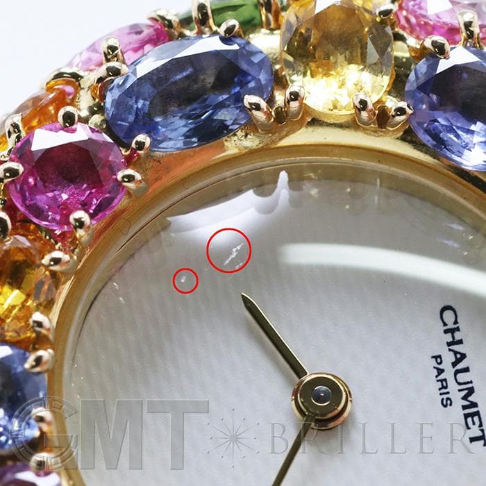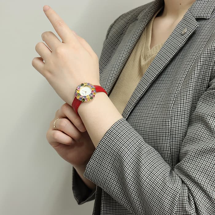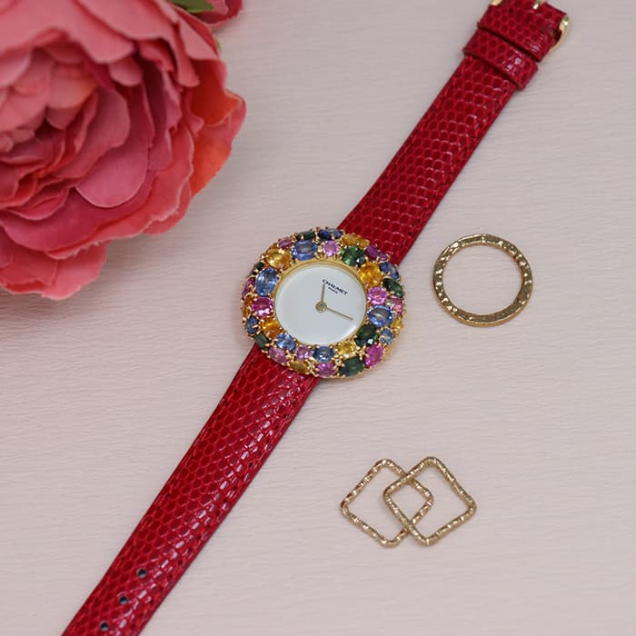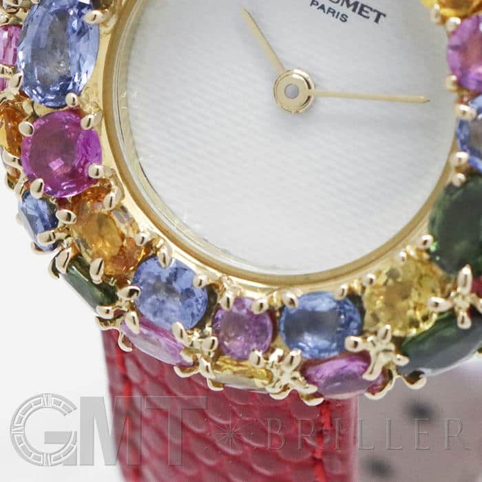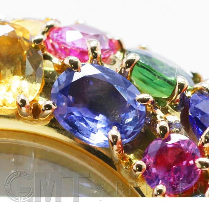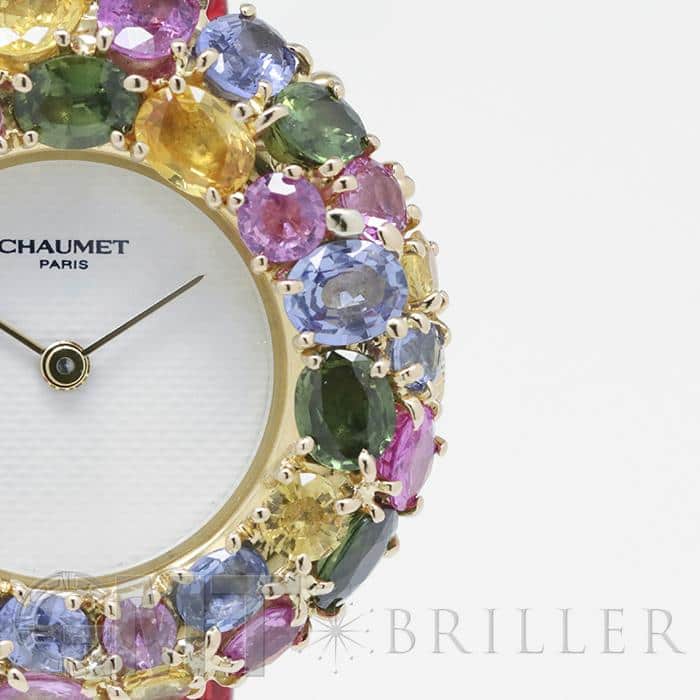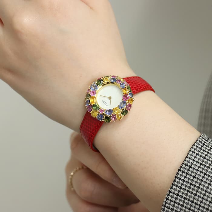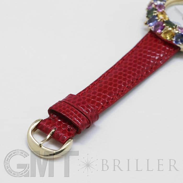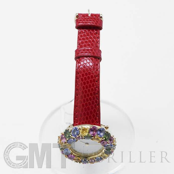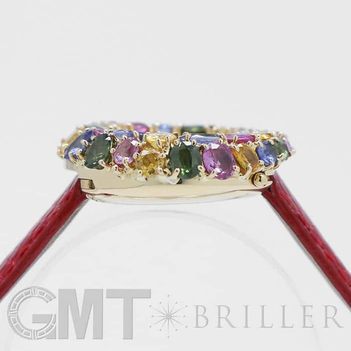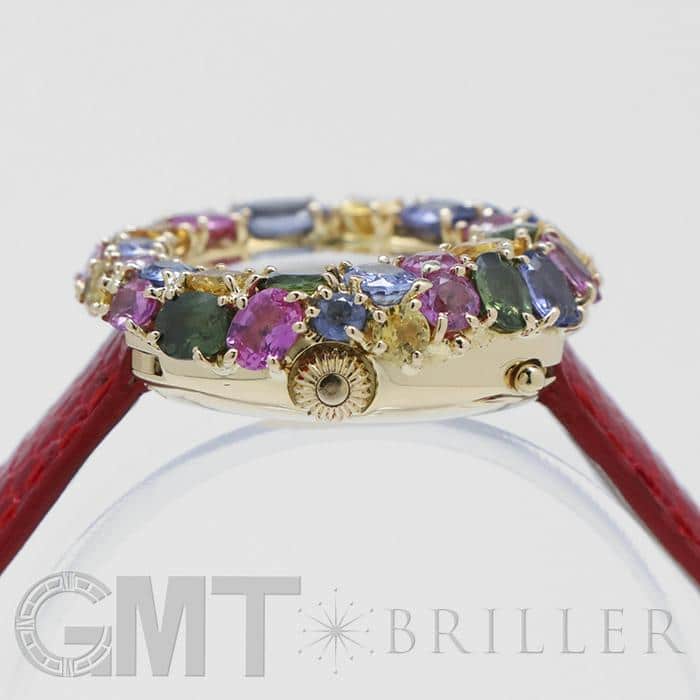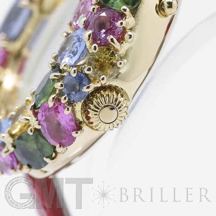 フランス語で「輪」を意味する「アノー(anneau)」は、丸みのある円形のコレクションであり、時計や指輪などがラインナップされておりました。 「098913」は、イエローゴールドを贅沢に使用したのケースに、カラフルなストーンが敷き詰められた華やかなモデルであり、これ1本でコーディネートの主役となる存在感抜群の腕時計です。