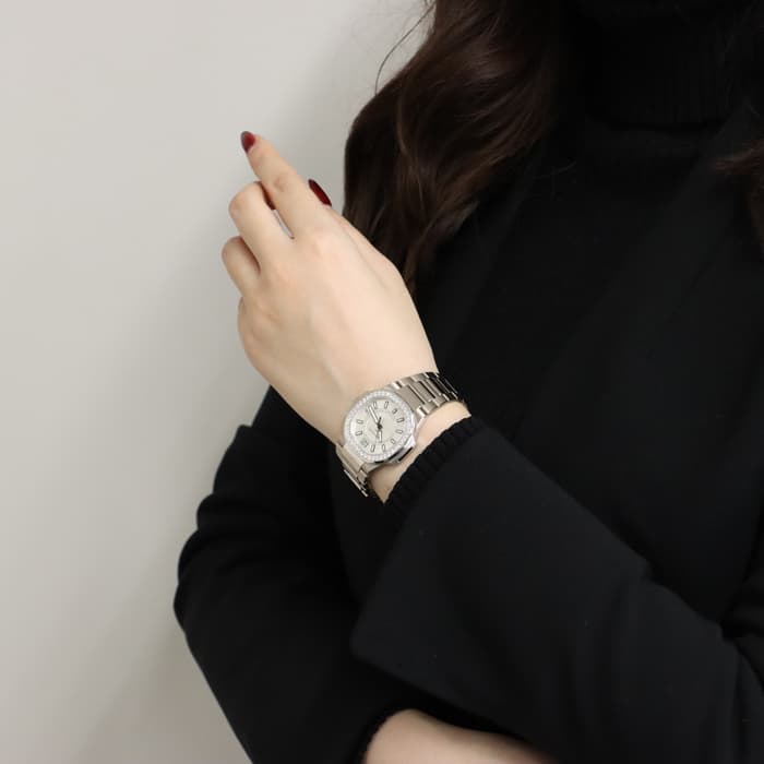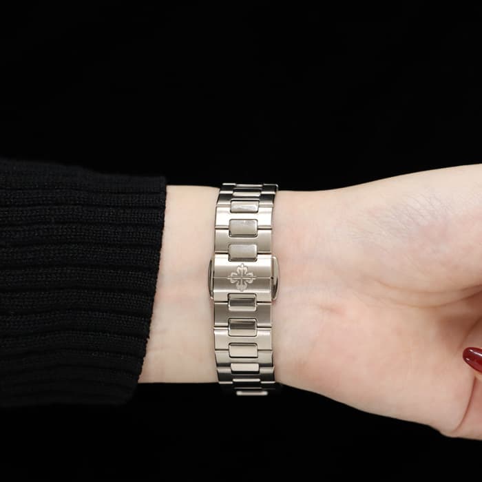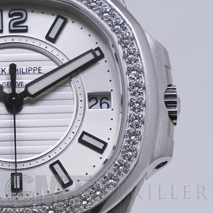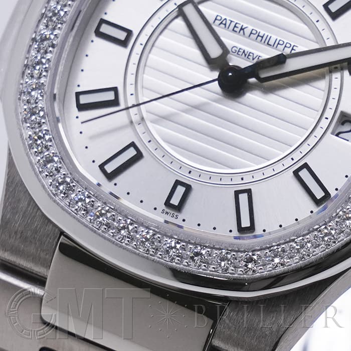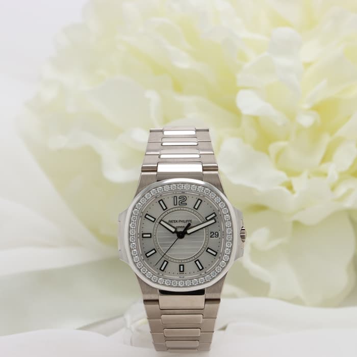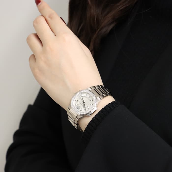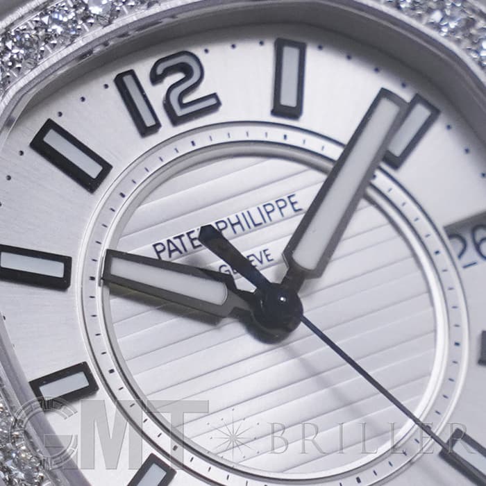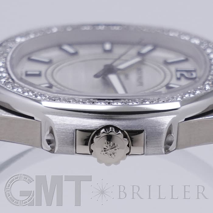1976年に発表され、ブランドを代表するラグジュアリースポーツウォッチ「ノーチラス」。ラグジュアリースポーツを体現するホワイトゴールドケースのレディースモデルです。八角形の丸みを帯びたベゼル、潜水艦「ノーチラス号」の窓からインスピレーションを得たケースが特徴的で、文字盤の中央のサークルにはノーチラスを象徴するエンボス加工が施されています。ベゼルには46個、計0.73カラットのダイヤが配置され美しい輝きを演出します。ラグジュアリーさが強調されたスポーティーかつエレガントな美しい1本に仕上がっています。クォーツ式ムーブメントが搭載されており、扱いやすいのもポイントです。流通量も少なくお勧めの時計です。