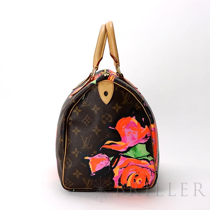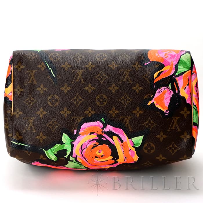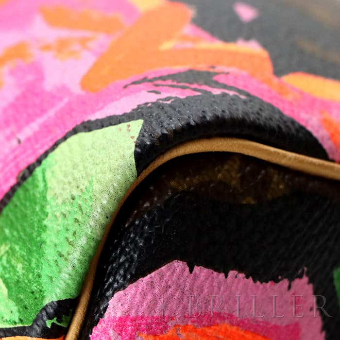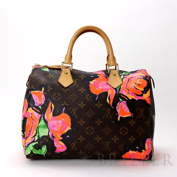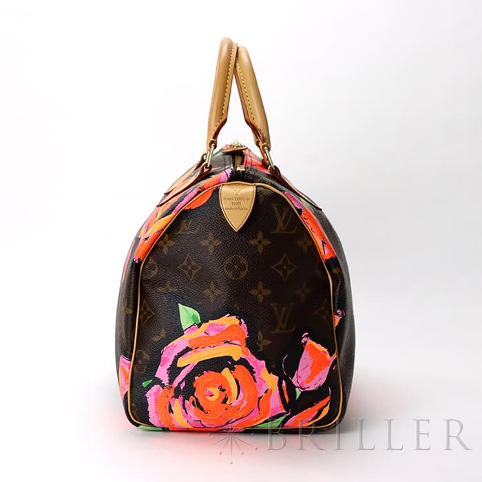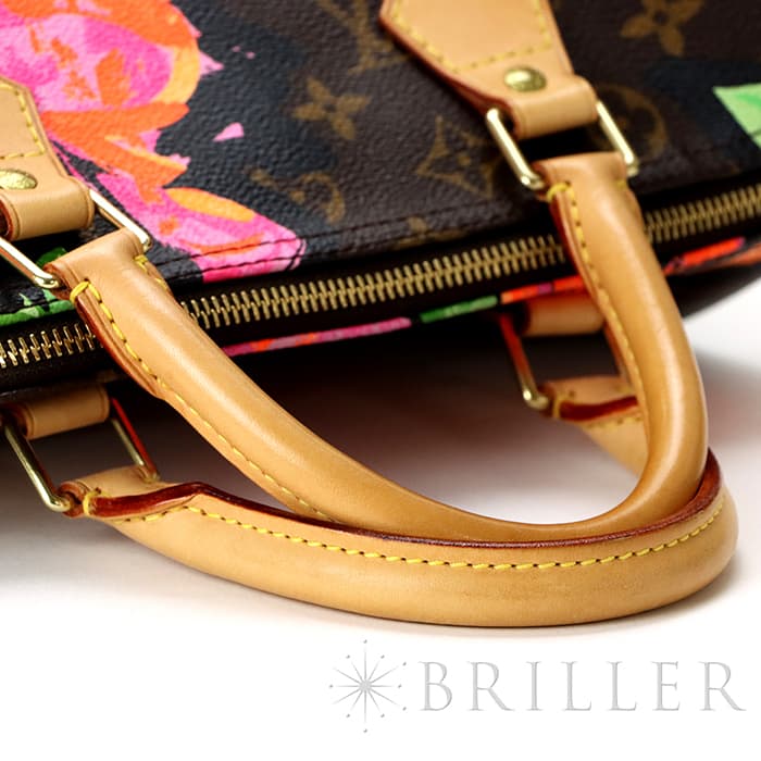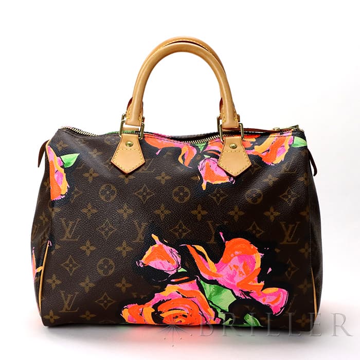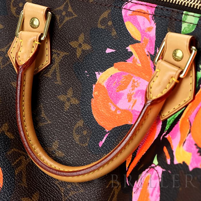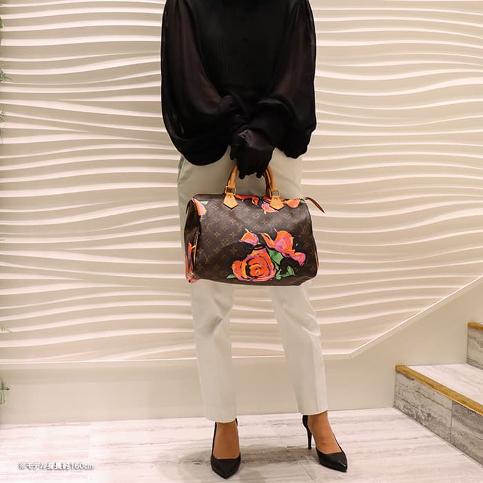 2009年にマークジェイコブスがデザイナーをつとめていた当時、グラフィティを発表したスティーブン スプラウスへのオマージュとしてデザインされた華やかな「ローズ」が、モノグラムにシルクスクリーンでプリントされた希少なスピーディーです。スピーディ30は圧倒的な収納力があるので、タウンユースから1泊2日程度の旅行にも幅広く活躍してくれます。ローズがアクセントに加わるため、シンプルなファッションに合わせて楽しみたいアイテムです。見た目とは裏腹にかなり軽量のため、普段使いがとてもしやすいバッグです。