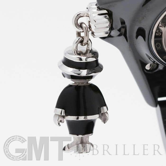 最も印象的なリューズに付いたハットとスーツ姿のココ シャネルのチャームは、ホワイトゴールド製で、手作業でブラックとホワイトのラッカーを施し、ハットにはブリリアントカットダイヤモンドをワンポイント入れています。