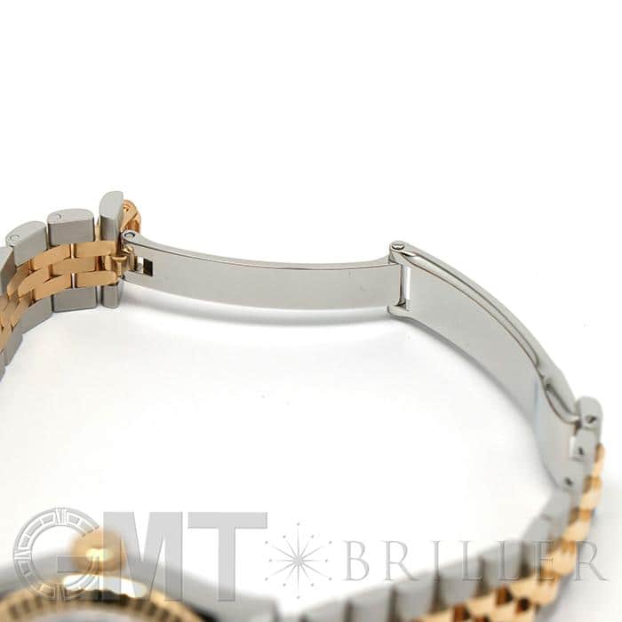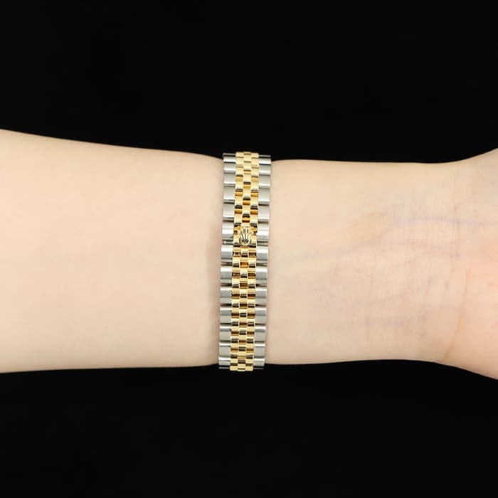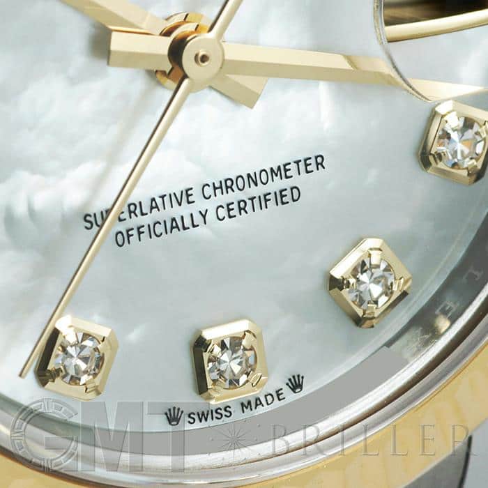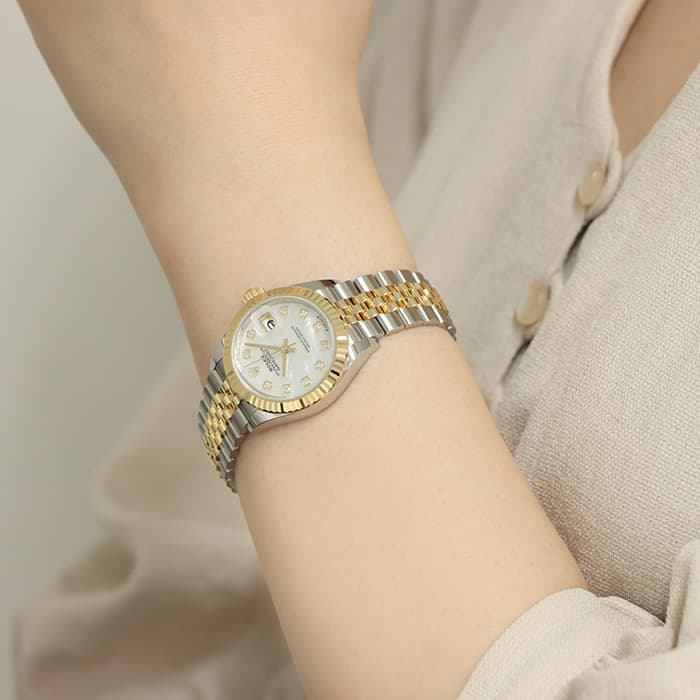 1945年に誕生してから、流行に左右されないデザインでロレックスのアイコンウォッチの1つとなった「デイトジャスト」コレクション。幅広いデザインが展開されているため、自分にぴったりの1本を見つけられます。ステンレスにイエローゴールドの組み合わせが華やかな印象のこちらの腕時計は、文字盤にホワイトシェルと10ポイントのダイヤモンドをセッティング。ラグジュアリー感溢れるモデルですが、ステンレスを合わせることで、デイリーに愛用できるほどよい落ち着きも持ち合わせています。ジュビリーブレスレットは片開式のバックルが上手くデザインに組み込まれおり、ブレスレット感覚で楽しめます。片開式のバックルは簡単に付け外しができるのもポイントです。