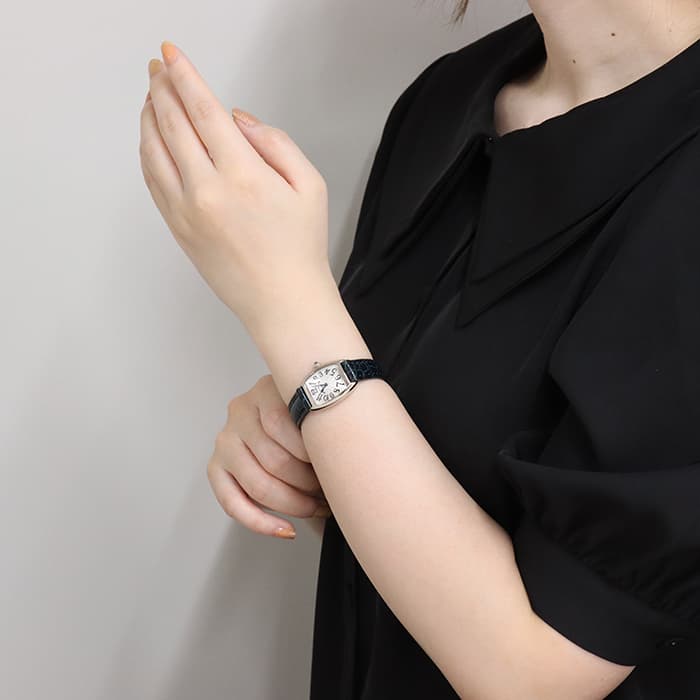 このモデルが登場したのは1996年頃で、レディースモデルは当時3つのサイズが展開されていました。フランス語で「中間」という意味を持つ「インターミディエ」は、名前の通り真ん中のサイズ感の腕時計です。約3cm×2cmのケースは現行モデルと比べるととても小ぶりに感じます。ころんと丸みを帯びたケースが可愛らしいです。素材にはホワイトゴールドが使用されています。手巻き式のムーブメントが搭載された本格機械式時計となっていて、シースルーバックから中の機械の様子をうかがうことができます。リューズでゼンマイを巻き上げながら使用する一手間で愛着が湧きます。日常にエッセンスを与えてくれるおすすめの1本です。