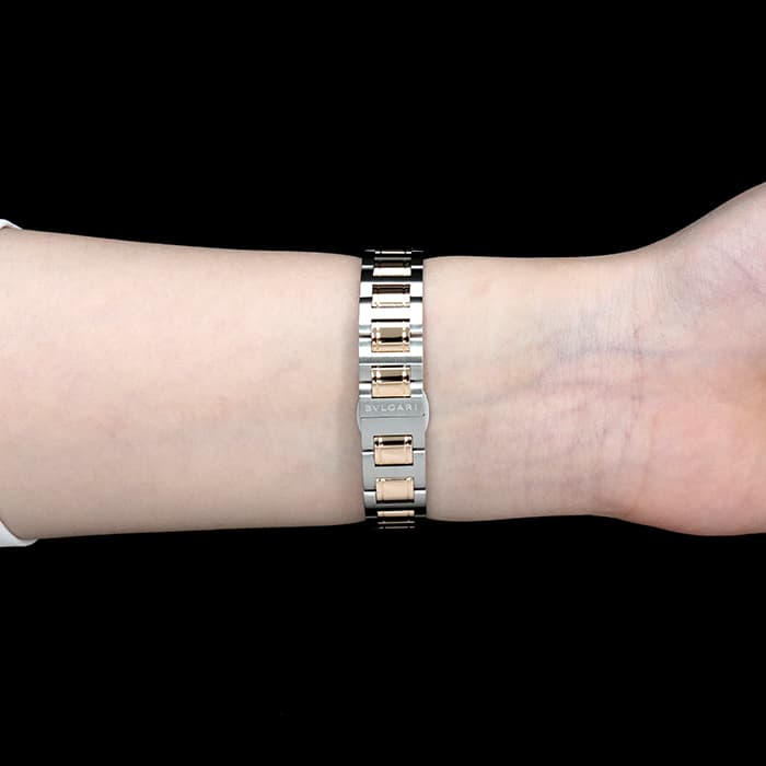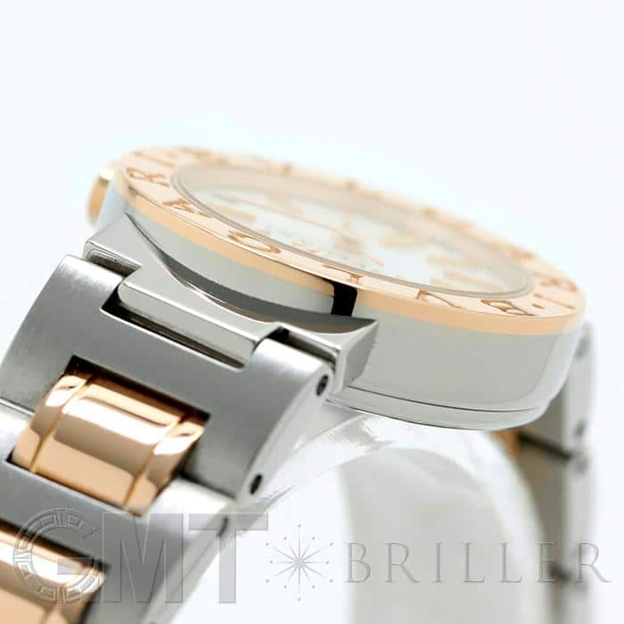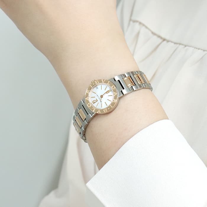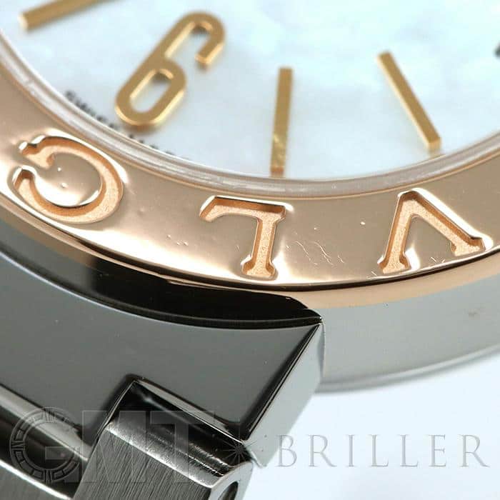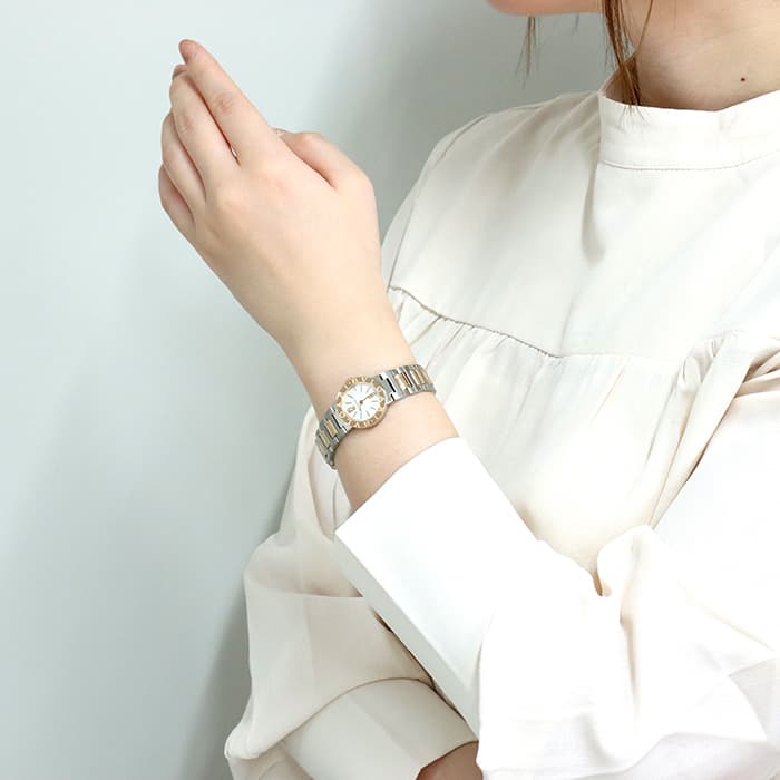イタリアを代表するハイメゾン ブルガリを代表するウォッチコレクション「ブルガリ・ブルガリ」。古代ローマのコインから着想を受けた、ラウンドケースのベゼルに刻まれた「BVLGARI」の文字が特徴です。こちらのモデルはピンクゴールド×ステンレスの組み合わせが上品で可愛らしいです。見る角度によって表情が変わるホワイトシェルの文字盤に、シンプルなバーインデックスを組合わせることで、洗練された印象に仕上がっています。カジュアルからビジネスまで幅広く活躍する腕時計ですので、ご自身へのご褒美に、大切な方へのプレゼントにもおすすめです。