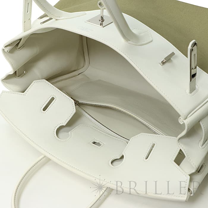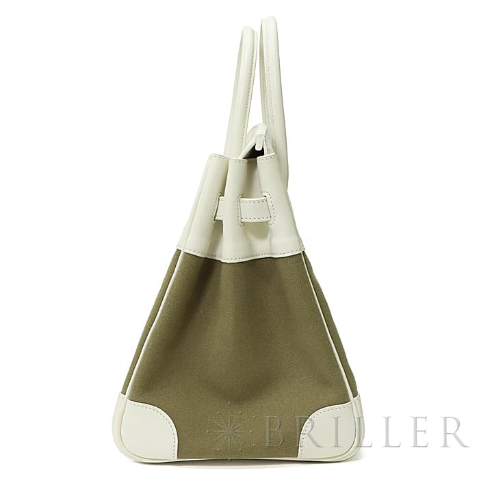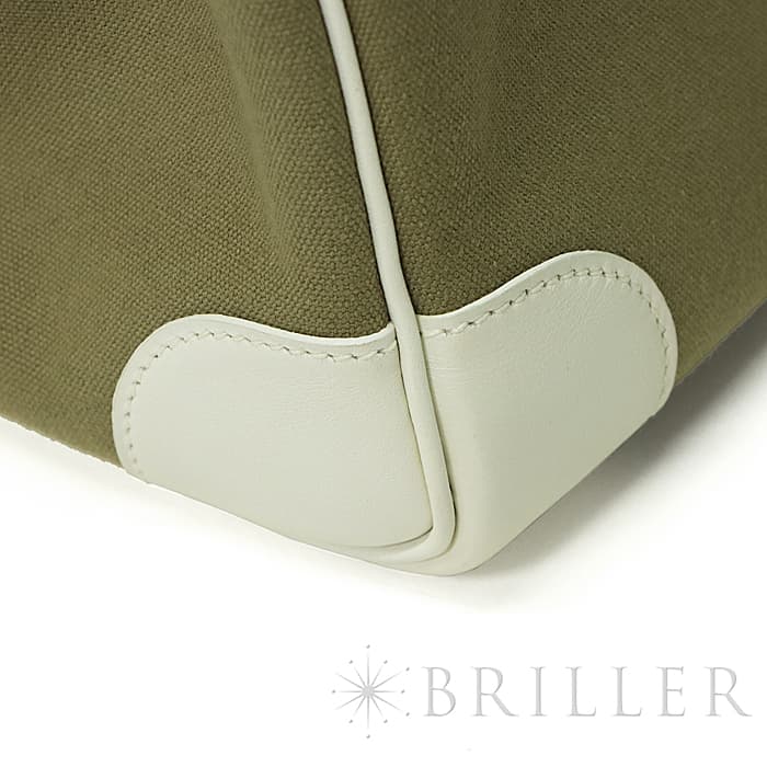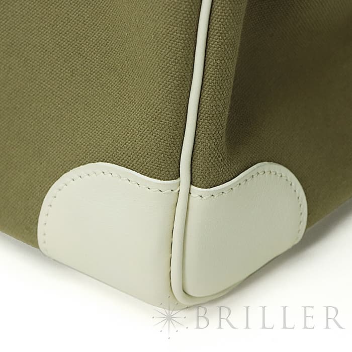 ホワイト色のヴォーガリバーと、カーキ色のトワルの組み合わせがおしゃれな「バーキン35」が入荷いたしました。ヴォーガリバーは現在は廃盤となった素材で、スイフトのようなしっとりとした触り心地が特徴です。カデナまでホワイトになっているので、より特別感を高めます。バーキン35はノートパソコンもすっぽりと入るサイズ感で、ビジネスはもちろん旅行にもご利用頂けます。コーディネートに爽やかなエッセンスを与える逸品です。□K刻印(2007年)のお品物で、金具に小傷、若干の使用感がございますが、大きく目立つ汚れなどはございません。