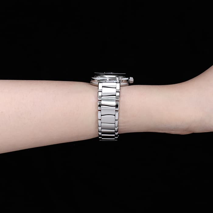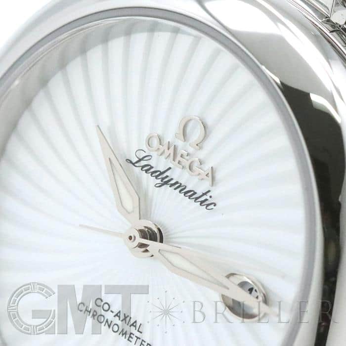 洗練されたアーバンなスタイルのレディマティック。1955年にオメガが女性のための本格機械式時計として、ブランドで初めて自動巻きムーブメントを搭載した女性用腕時計レディマティックを発表しました。現在は女優のニコール・キッドマンがこの腕時計のアンバサダーを務めています。ラウンドケースにダイヤモンドを使用した可愛らしくもラグジュアリーなデザインが特徴で、こちらの腕時計はホワイトシェル文字盤にスーパーノヴァ模様がドラマティックに手元を彩ります。優美な曲線を描いたブレスレットのコマのデザインは、このコレクションだけのもの。ステンレス素材なのでデイリーにご利用頂きやすいです。