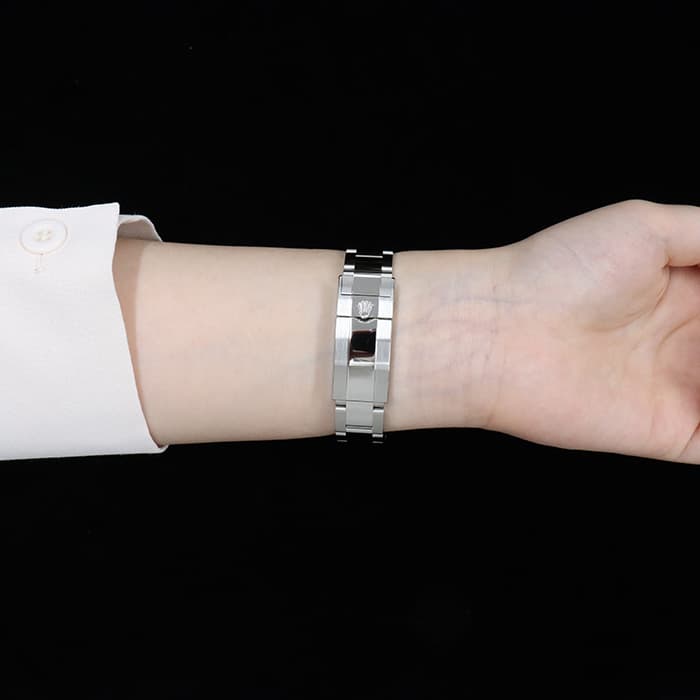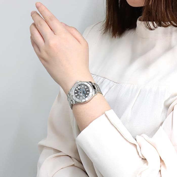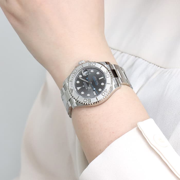 ヨットマスターの37mmケース径モデル「Ref.268622 ダークロジウム」。 オン・オフどちらでも活躍する落ち着いたグレー系の文字盤に爽やかなブルーの挿し色が特徴です。 120個もの刻みとトリゴナル・スプリングによりよりスムーズな回転が実現したプラチナ素材のベゼルを備え、 バックルはクラスプ内に収納されたエクステンションパーツで約5mm単位で長さ調整が可能になっています。 37mmというサイズは、小さめの時計がお好きな男性はもちろん、 スポーティなデザインをお求めの女性にもおすすめです。