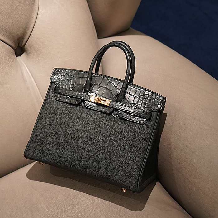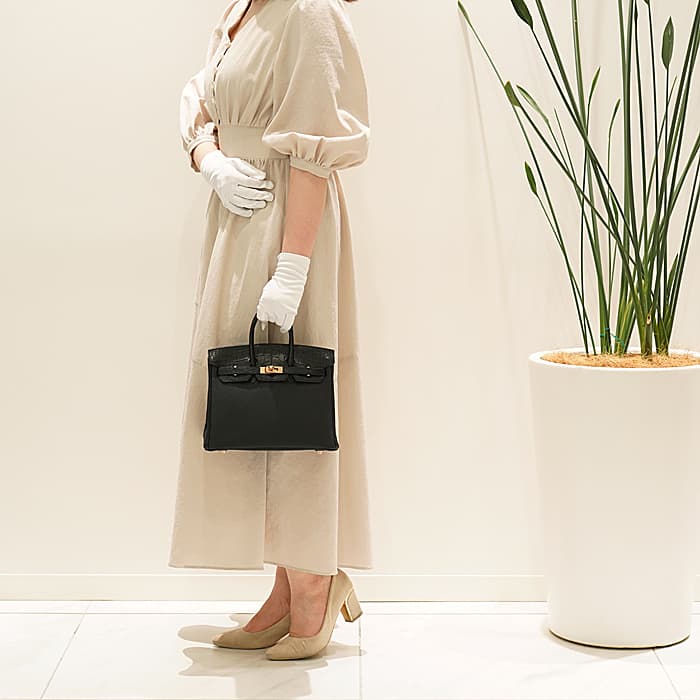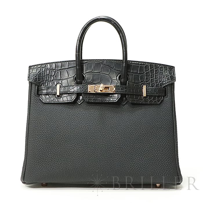バーキンにクロコダイルを組み合わせた特別な「バーキンタッチ」。 落ち着いたマット加工は、近年クルマでもハイエンドなラインで使われるラグジュアリーな雰囲気で、人気が高まっています。 ブラックは様々なコーディネートに合わせやすく、ファーストバーキンとしても高い人気を誇り、そこにピンクゴールド金具を組み合わせることで、フェミニンさとゴージャス感を演出しています。 「バーキン25」はハンドバックとして軽やかに使いやすく、年齢問わずに人気のサイズで、パーティーからオケージョンまで活躍します。女性らしさを格上げしてくれそうな一生物の逸品です。
