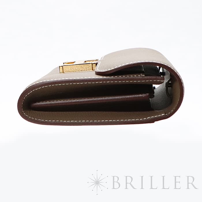 ブランドの頭文字”H”マークが特徴の「コンスタンス」コレクションに、新たに「コンスタンス トゥーゴー」が加わりました。クラッチバッグとしても、ウォレットとしても、ショルダーストラップを付けると肩にかけることもできます。中はカードケースが6つ、スマートフォンも入るフリーポケットが2つ、そして中央にファスナー付きのポケットが付いている使い勝手が良い点も魅力的です。素材は型崩れしにくく、キズに強いエプソンで、色はグレージュが気品溢れるエトゥープです。Z刻印(2021年)の未使用のお品物です。