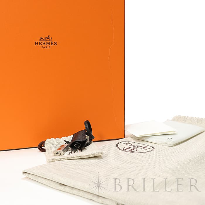 「バーキン」の由来は歌手の「ジェーン・バーキン」が航空機でエルメスの社長と出会い、彼女が使っていたバッグから物があふれ出そうな様子を見て、物をたくさん入れられるバッグとしてつくられました。大きく広い開口部から整理をせずに物を入れることができる秀逸な「バーキン」は全世界で愛されています。トゴはほどよく張りのあるやわらかな質感で、使い込むごとに馴染んでいきます。定番のブラックはバーキンのエレガントな雰囲気を堪能でき、さまざまなシーンに使いやすいので、ファーストバーキンにおすすめです。 前面に一部膨らみ、ハンドル根本部分にコバ割れ、金具に変色、背面に微細な線キズがありますが、金具の保護テープなども残っており、比較的状態の良い□N刻印(2010年)のお品物です。 箱に皴がありますが、保管には問題ありません。