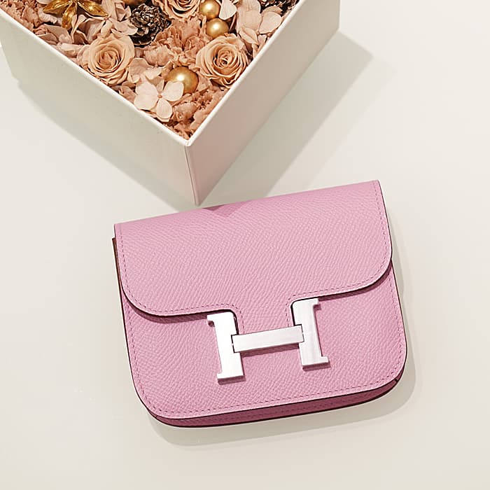 1969年に誕生した“H”マークの金具にコロンと丸みを帯びたフォルムが特徴の「コンスタンス」は、当時としては珍しい、長さ調節ができる画期的なショルダーバッグとして話題を呼びました。2020年、コンスタンスのアイコニックなデザインはそのままに、お財布として生まれ変わった「コンスタンス スリム」が登場しました。内側にはポケットが2つ、そして取り外しのできるコインケースが1つ付いています。サイズは縦10cm×横12.5cm×幅3cmとコンパクトですので、例えばコンスタンス3ミニの中にも収納できます。また、背面にはベルトループが付いているので、ウエストポーチとても活用できます。おしゃれの幅を広げてくれるおすすめのお財布です。U刻印(2022年)の未使用のお品物です。