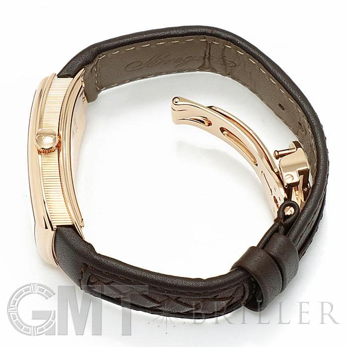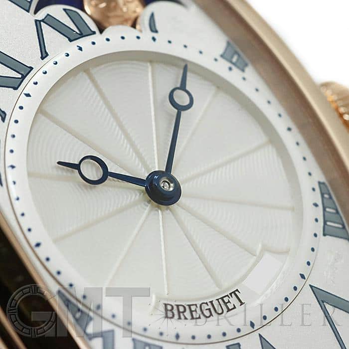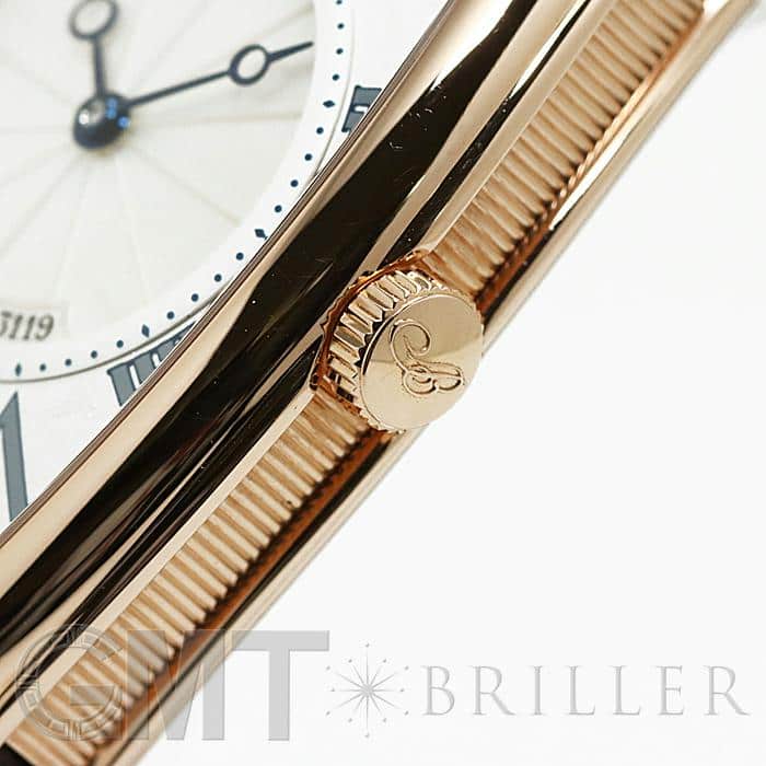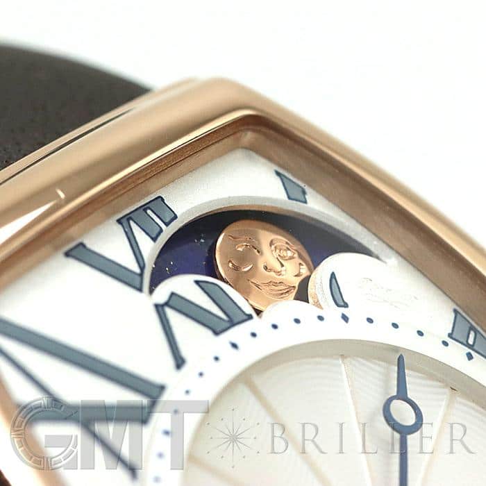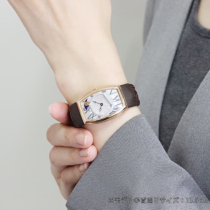 18世紀のスタイルを現代的なフォルムに応用したトノーケースモデル「ノーカンブレ」。ブルースチールのブレゲ針や2種類の手掘りのギョウシェ彫り、ケースサイドのコインエッジなどブレゲの伝統を感じるモデルです。遊び心をくすぐる、1時位置に配置されたレトログレイド式ムーンフェイズが特徴的な印象を与えてくれます。ギョウシェ彫りのホワイトの文字盤にローズゴールドのケースが良く映え、華やかな雰囲気でご使用頂けます。湾曲したケースは腕にもフィットしやすく、高い着用感を実現したモデルとなっています。