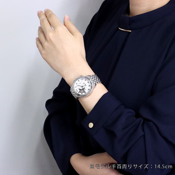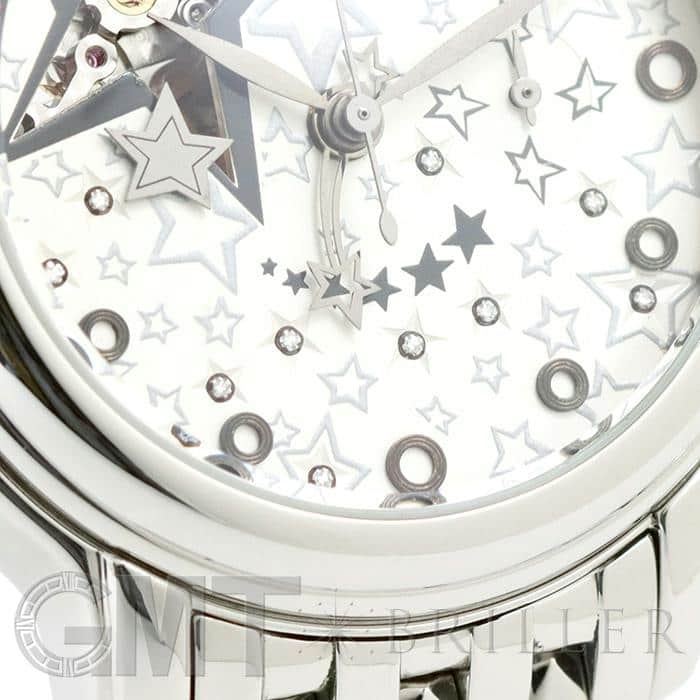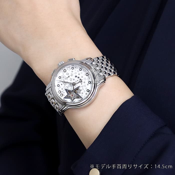 9時位置にはスモールセコンドとして星のモチーフが優雅に回転し、3時位置には30分積算計、6時位置にはパワーリザーブインジケーターを搭載。視覚的な楽しさと実用性を両立しています。