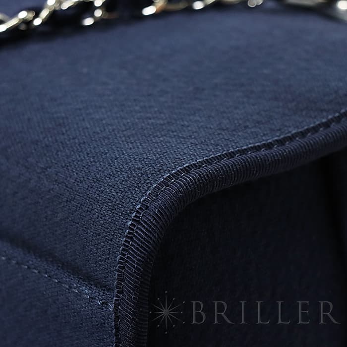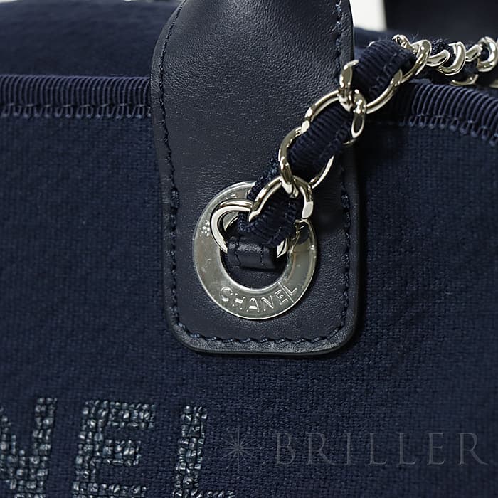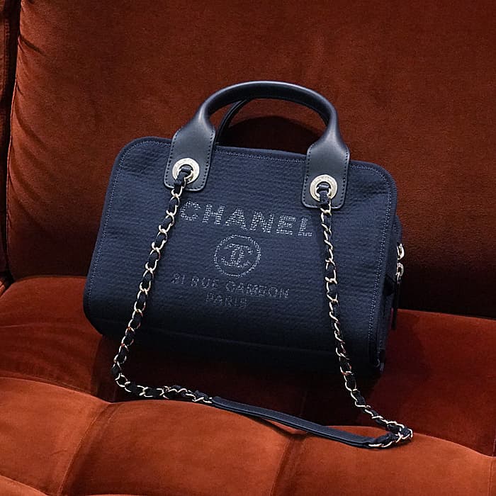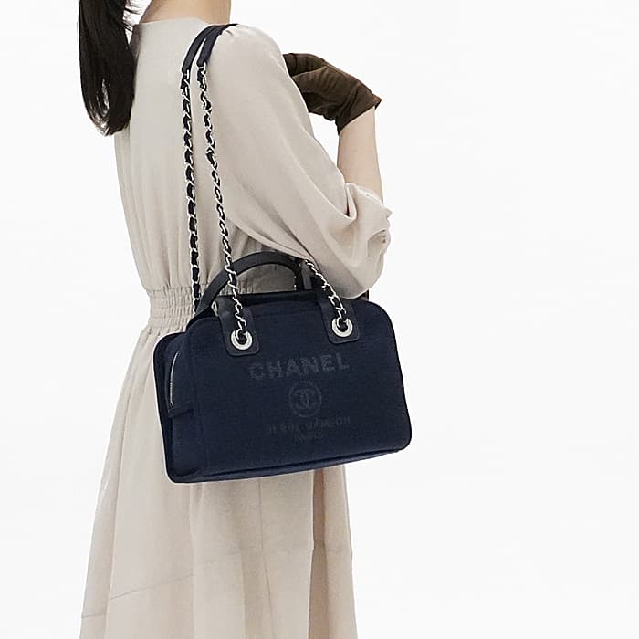 シャネルのドーヴィルはキャンパス地を使用しカジュアルな装いにピッタリです。スクエア型の可愛らしいフォルムが特徴的でネイビーカラーと合わせ程よい大人っぽさを演出します。シャネルのアイコニックなチェーンでショルダーバッグとして、ハンドルを持ってチェーンを揺らしても、軽やかに使えます。
