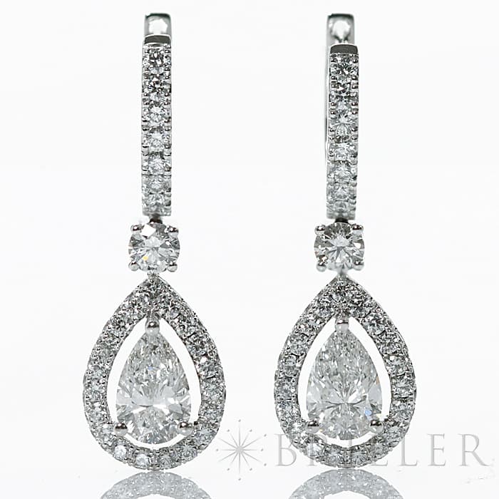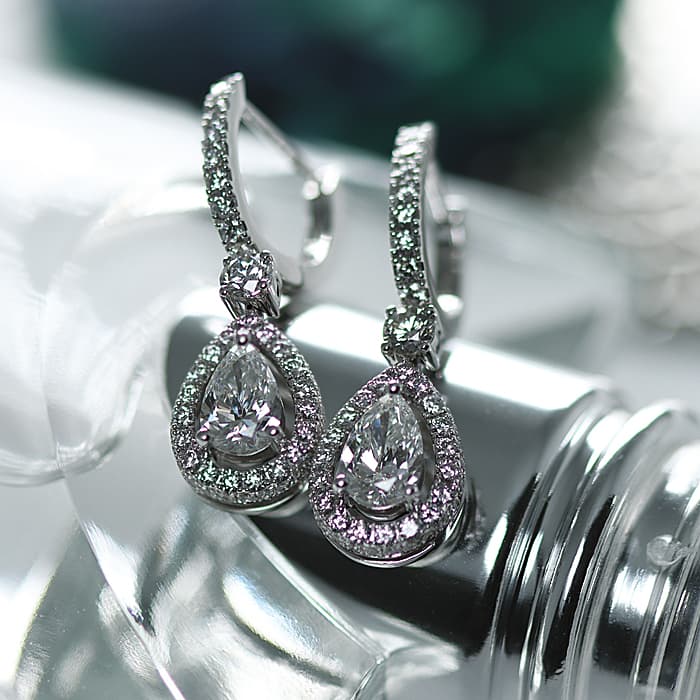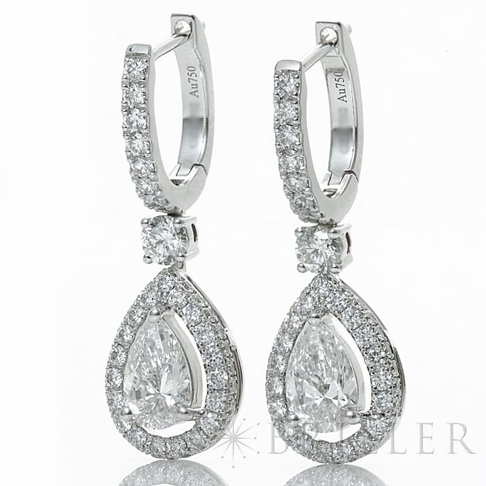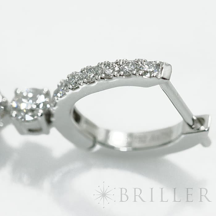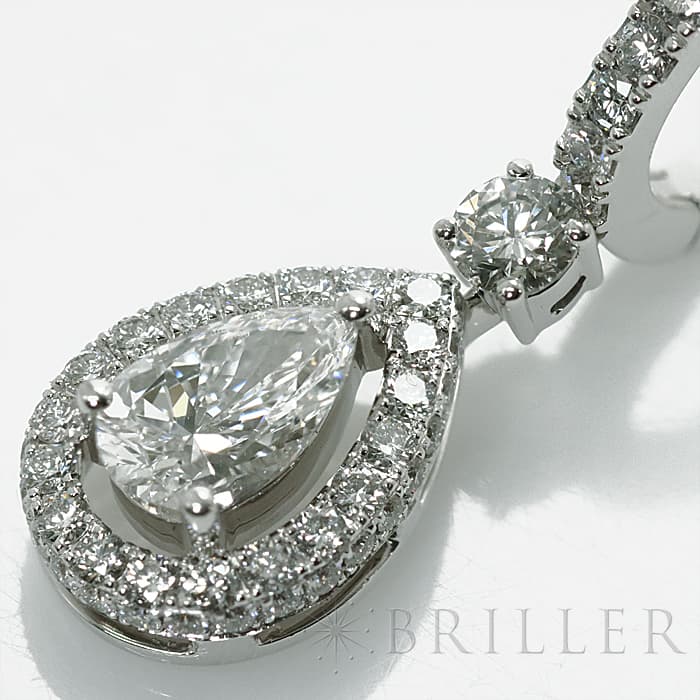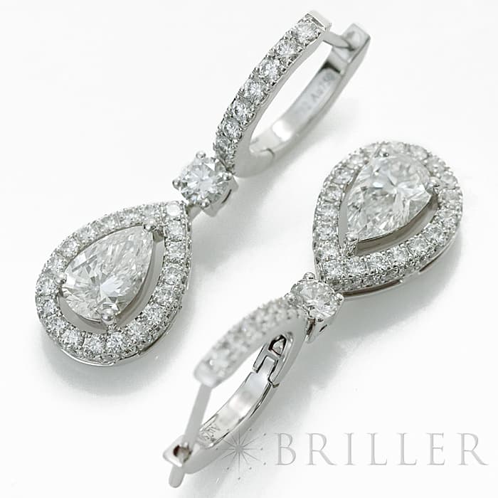 「鉱山から女性を飾るジュエリーまで」の理念を掲げるハイジュエラー「グラフ」。徹底した品質管理のもと販売されるダイヤモンドは、「キング・オブ・ダイヤモンド」と称されるハリーウィンストンとも肩を並べるほどです。こちらはペアシェイプと呼ばれる楕円型のデザインが特徴で、カット面が多く反射光の多さから存在感のある輝きを放ちます。さらに周りにメレダイヤモンドをセッティングした贅沢なピアスです。