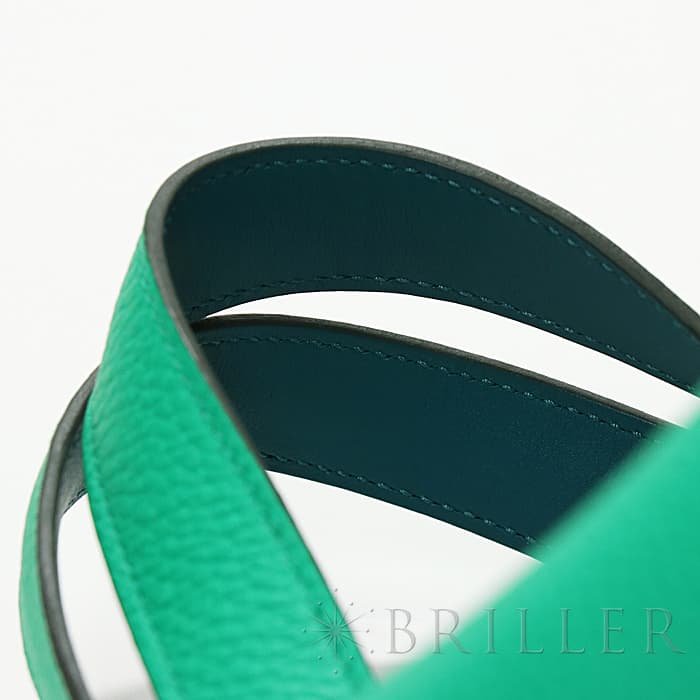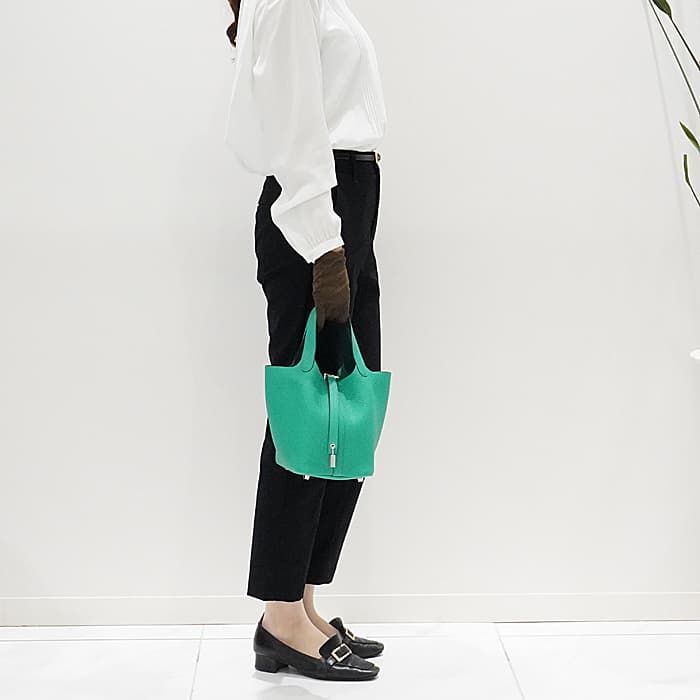 2003年に発表された「ピコタン」は、牛馬用の飼料袋から着想を得たエルメスならではのバッグ。丸みのある愛らしいフォルムと気軽に持てるデザインで、近年さらに人気を高めています。こちらは定番のピコタンロックPMの中でも、ハンドル内側の配色が異なる「エクラ」仕様。ベースには爽やかなビタミンカラーのミント、内側には深みのあるヴェールヴォスフォールを配し、さりげないコントラストが装いに個性を添えます。シルバー金具が全体を引き締め、洗練された印象に仕上がった特別感のある一点です。