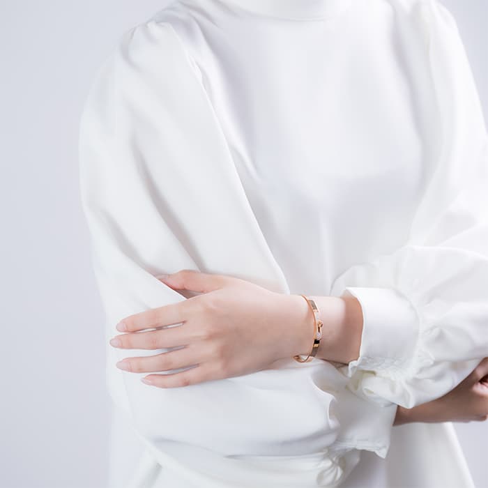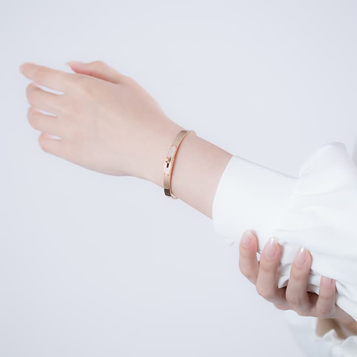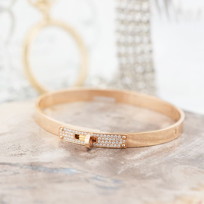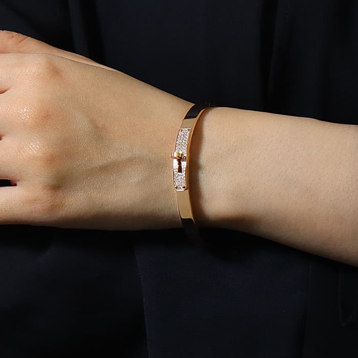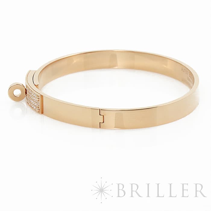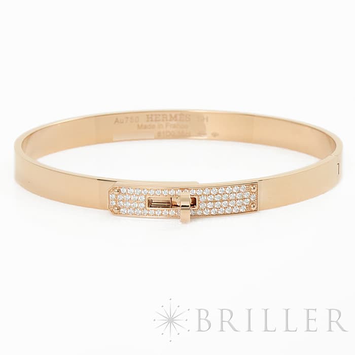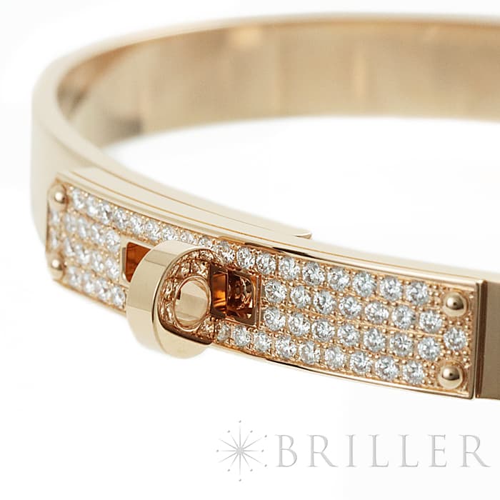 エルメスのバッグコレクション「ケリー」の名を冠したブレスレット が入荷しました。ケリーに使用されている留め金のトゥレを使用した上品なブレスレットです。ピンクゴールドは肌馴染みが良く、セッティングされたダイヤモンドが腕元を華やかに飾ってくれます。オススメなモデルです。