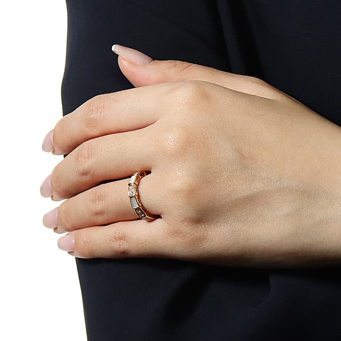 シンプルな構成ながらもホワイトシェルとダイヤモンドが交互に輝く存在感のあるリングです。