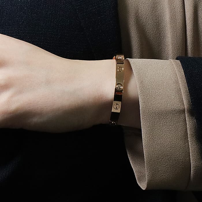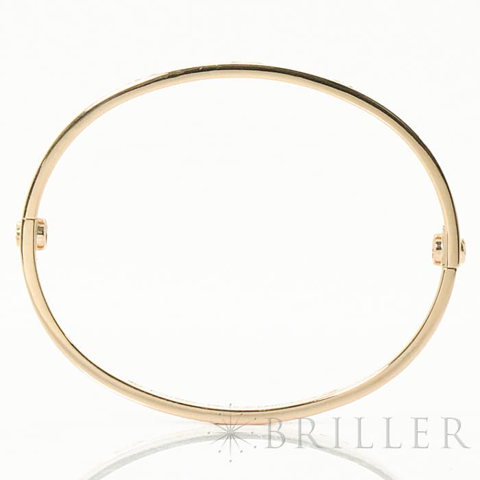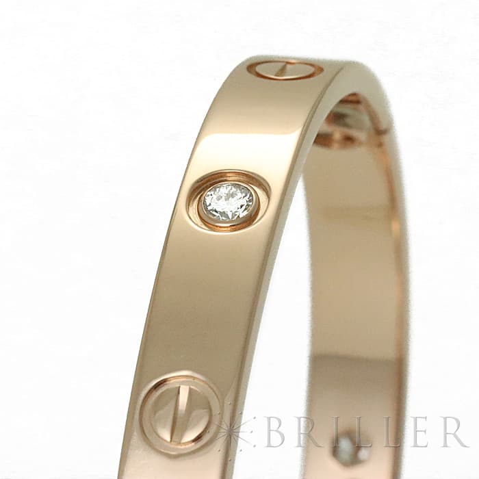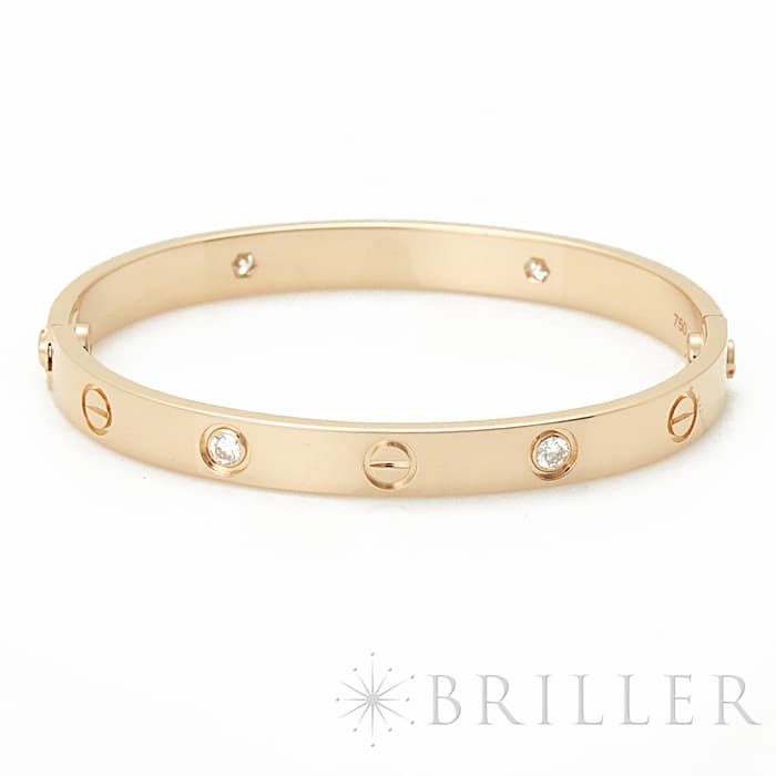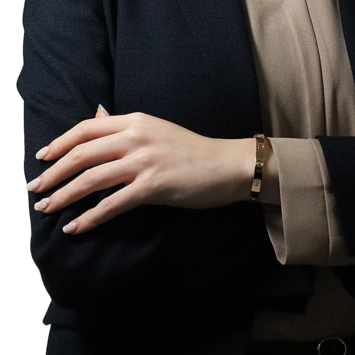 世界5大ジュエラーのひとつである「カルティエ」。1970年代にニューヨークで生まれたLOVE コレクションは、愛の絆を象徴するビスモチーフが特徴のコレクションです。こちらは肌なじみの良いピンクゴールド素材にビスの代わりとしてブリリアントカットの贅沢なダイヤモンドを配置、1本使いでも圧倒的な存在感を放つモデルとなっています。形状はバングル型でシンプルですので、ほかのジュエリーとの重ね付けにも違和感なくご使用いただけます。