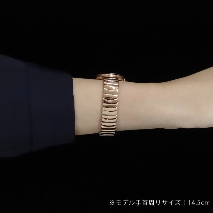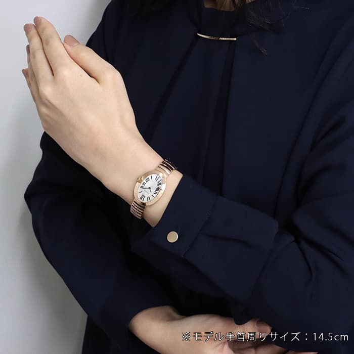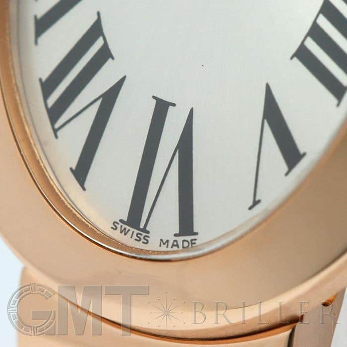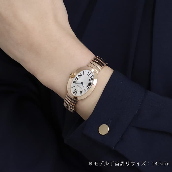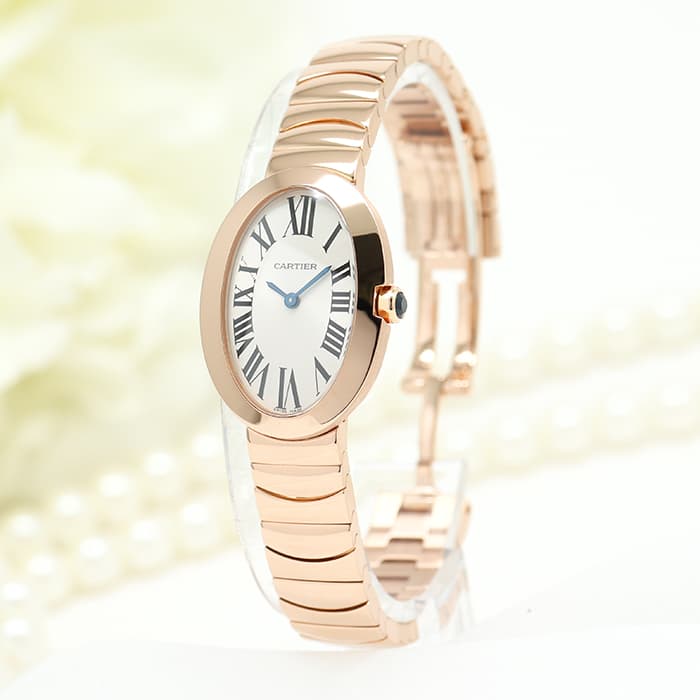 オーバル型のケースが特徴的なカルティエレディースウォッチの人気シリーズ「ベニュワール」。フランス語で「バスタブ」の意味を持つ、オーバル型の優美なデザインで親しまれています。気品溢れるピンクゴールド素材が上品な印象を与え、丸みを帯びた時計全体のフォルムが人に柔らかい印象を与えます。バックルは両開きタイプでシームレスなデザインなので、全体的に一体感がありすっきりとした仕上がりになっています。滑らかな肌当たりのブレスレットで、極上の着け心地を実現しています。