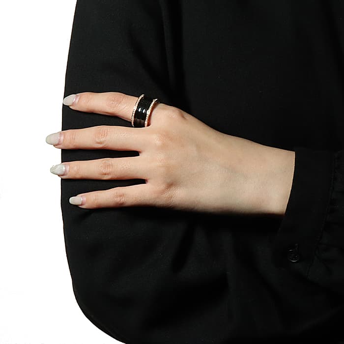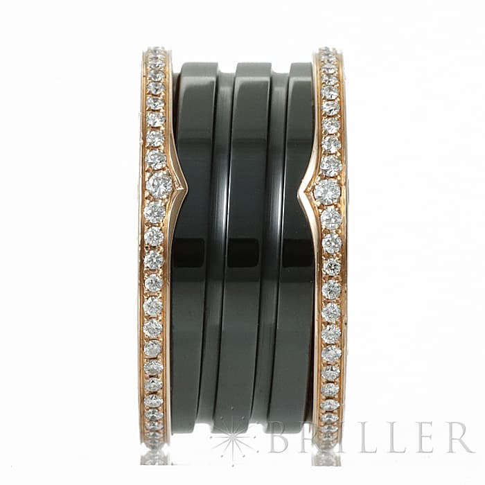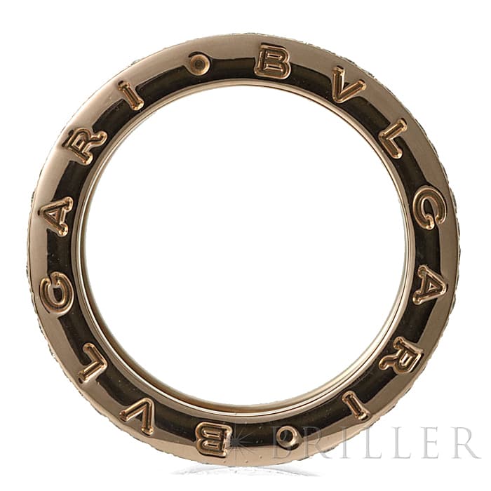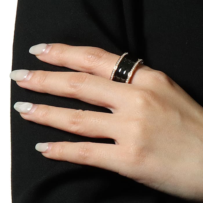 ブルガリの代表コレクション「ビー・ゼロワン」。イタリア・ローマのコロッセオからインスピレーションを受けデザインされた「ビー・ゼロワン」は、1999年に誕生して以来、ブランドのアイコンとして愛され続けています。パヴェダイヤモンドをあしらった18Kピンクゴールドと、ブラックセラミックを大胆に掛け合わせた高級感あふれるリングです。