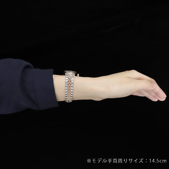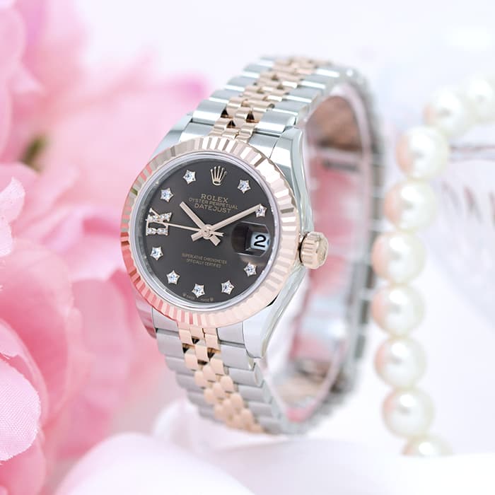 「179171」の後継モデルとして誕生した「デイトジャスト 279171」。 チョコレートブラウンの文字盤は、エバーローズゴールドの色味と相性が良く、落ち着いたラグジュアリー感を演出します。 ドレスウォッチらしい繊細なデザインのジュビリーブレスレットは、細かいブレスレットリンクが滑らかな肌当たりで極上の着け心地を実現しています。 インデックスには9ポイントのスターダイヤに加え、ローマ数字の「IX」にもダイヤモンドをセッティングするなど、ワンランク上の贅沢な仕様となった1本です。