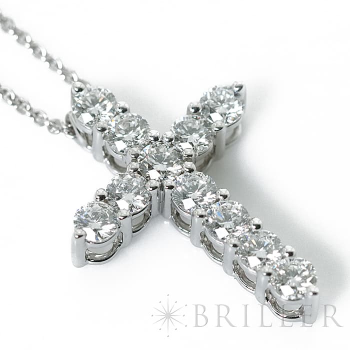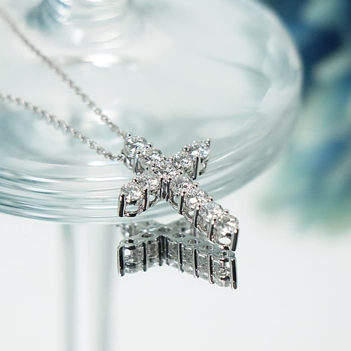 「鉱山から女性を飾るジュエリーまで」の理念を掲げるハイジュエラー「グラフ」。徹底した品質管理のもと販売されるダイヤモンドは、「キング・オブ・ダイヤモンド」と称されるハリーウィンストンとも肩を並べるほどです。こちらのネックレスはシンプルなクロスデザインながら、贅沢にダイヤモンドがセッティングされ高級感を演出。グラフらしい圧倒的な輝きで首元を華やかに彩ります。