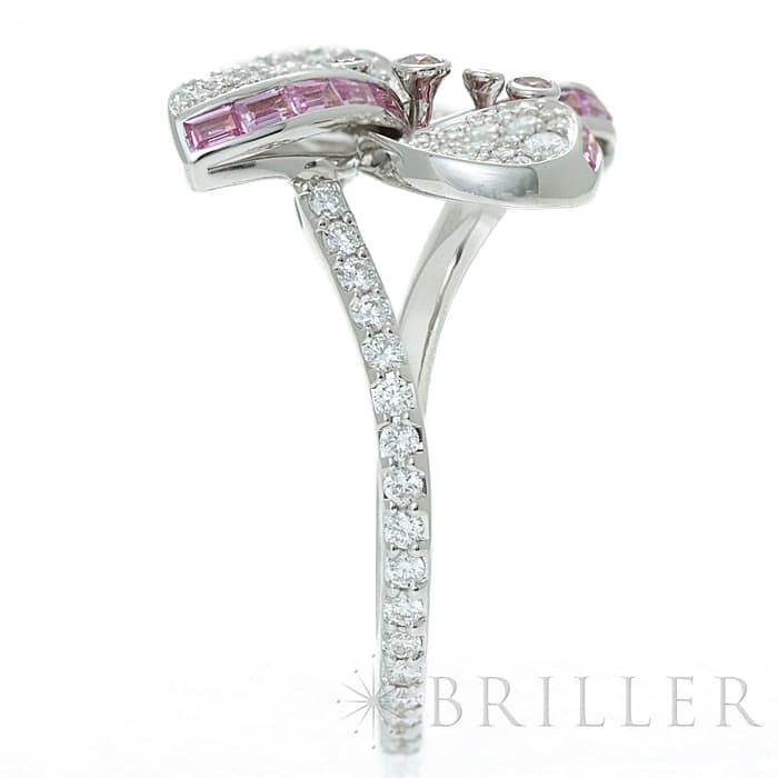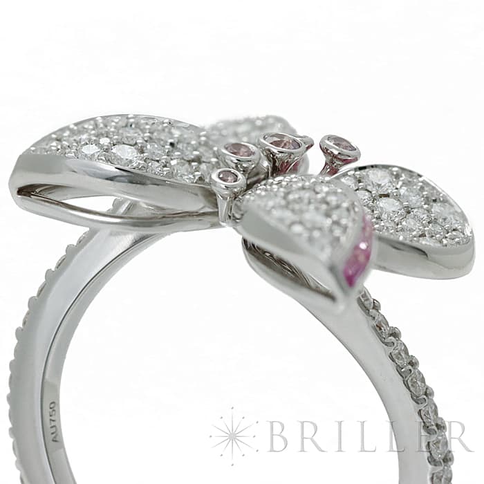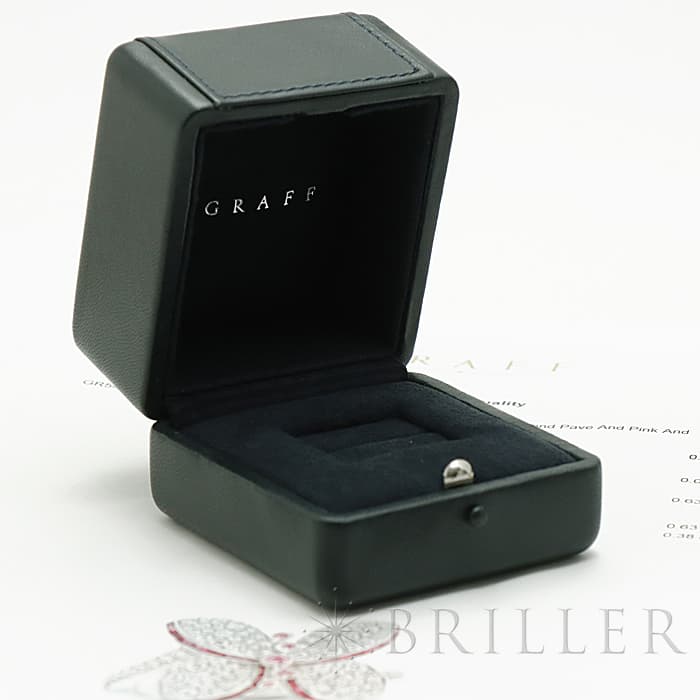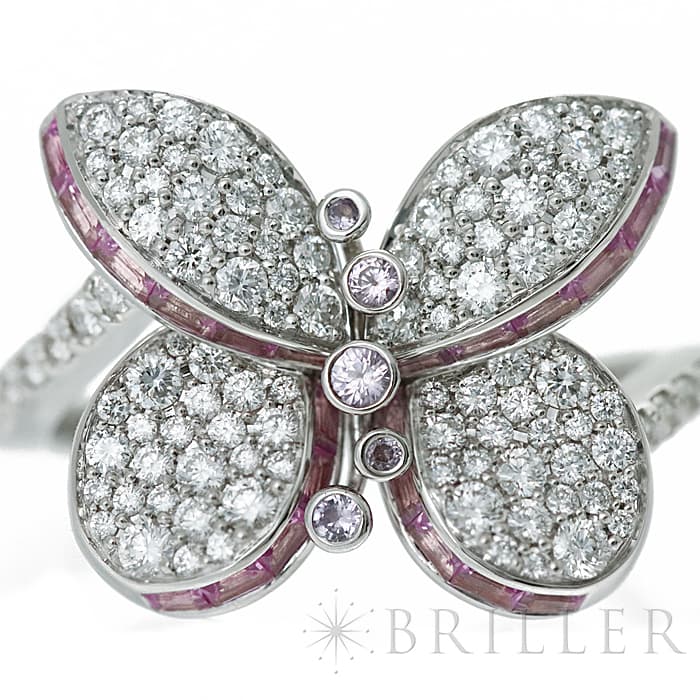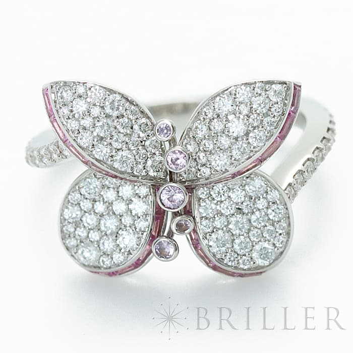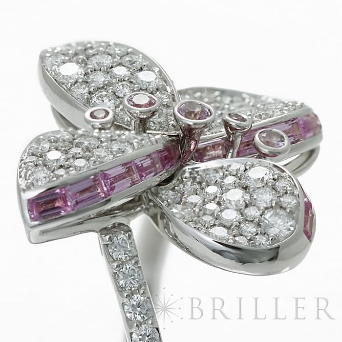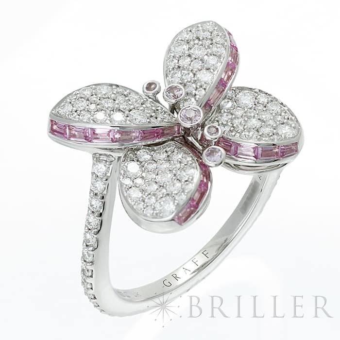 ダイヤモンドのクオリティにおいてトップレベルと評されるイギリスのジュエラー「GRAFF(グラフ)」。 バタフライコレクションはグラフのアイコニックな存在で、パヴェダイヤモンドの繊細かつ上品な美しさが印象的です。 またこちらのリングは22個のピンクサファイアと5個のパープルサファイアが付き、差し色が入ることでより可愛らしさを感じさせます。 整然とダイヤモンドが埋め込まれた腕の部分は、華奢でねじれるようなデザインとなっており、指を美しく見せてくれます。 127個ものダイヤモンドは、手にした方だけが楽しめる極上の輝きです。