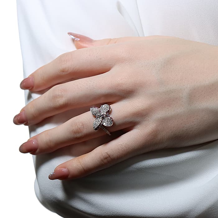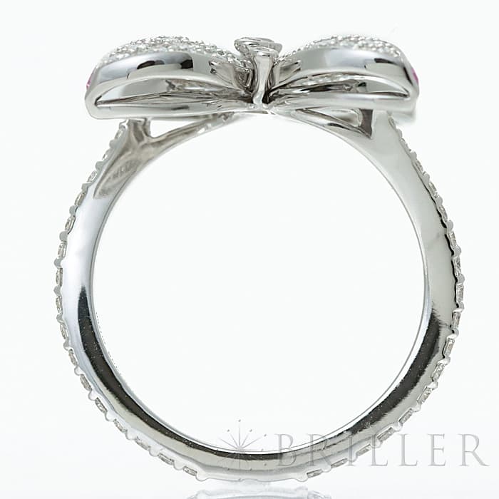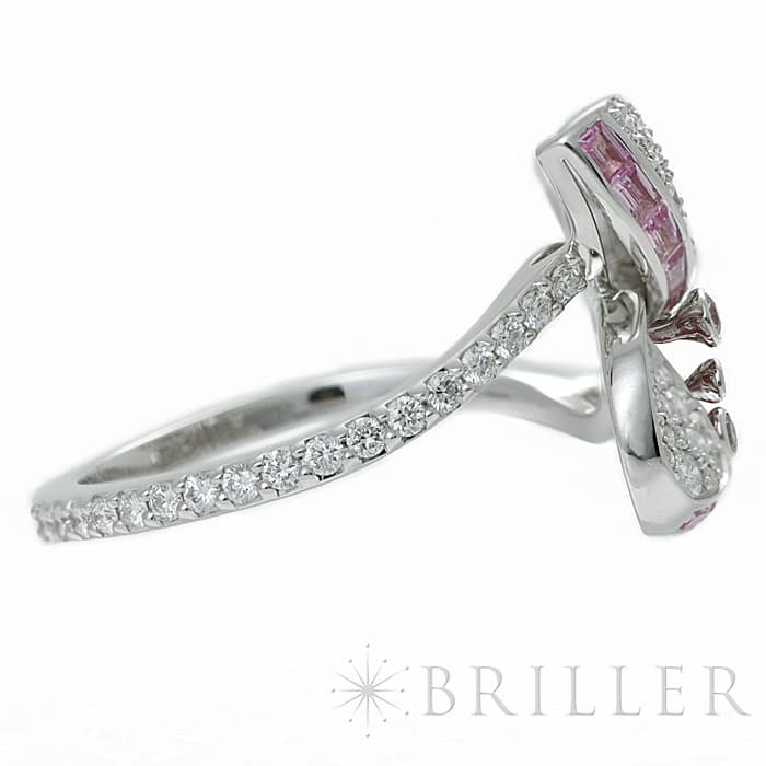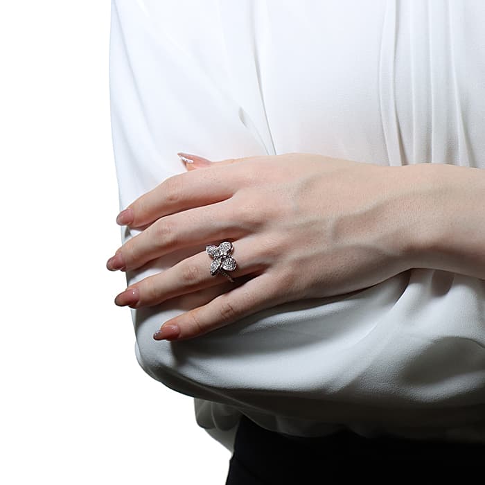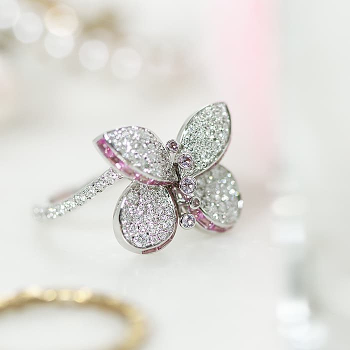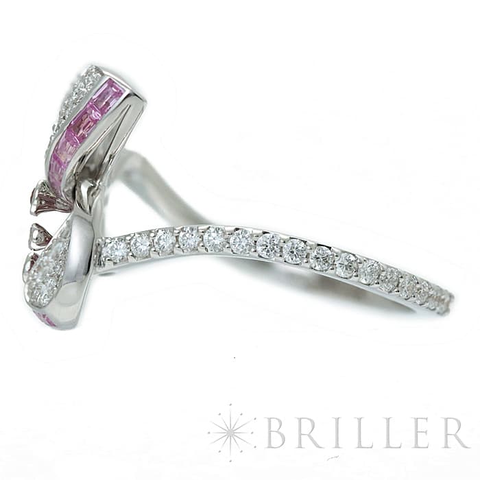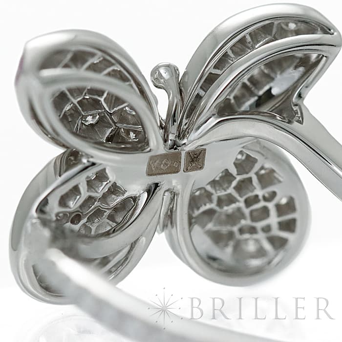 ダイヤモンドのクオリティにおいてトップレベルと評されるイギリスのジュエラー「GRAFF(グラフ)」。 バタフライコレクションはグラフのアイコニックな存在で、パヴェダイヤモンドの繊細かつ上品な美しさが印象的です。 またこちらのリングは22個のピンクサファイアと5個のパープルサファイアが付き、差し色が入ることでより可愛らしさを感じさせます。 整然とダイヤモンドが埋め込まれた腕の部分は、華奢でねじれるようなデザインとなっており、指を美しく見せてくれます。 127個ものダイヤモンドは、手にした方だけが楽しめる極上の輝きです。