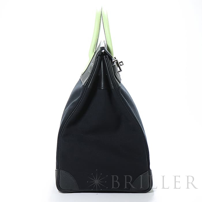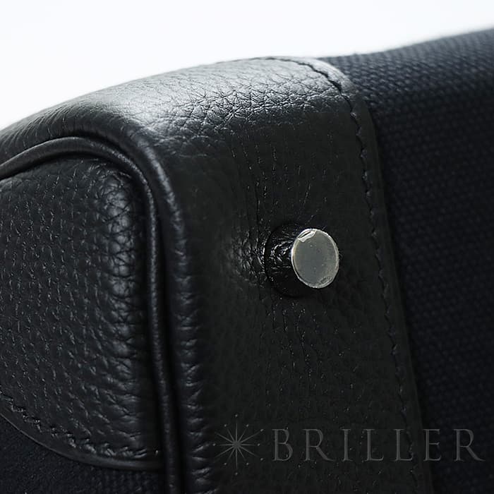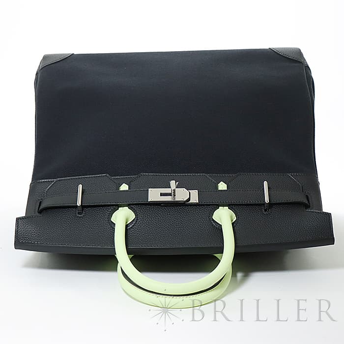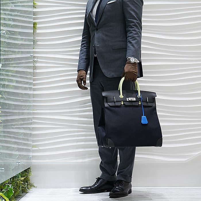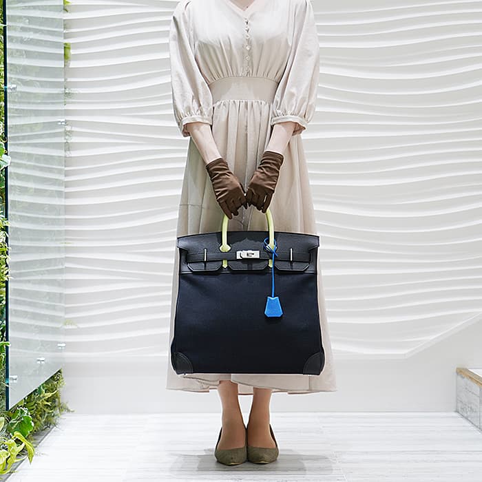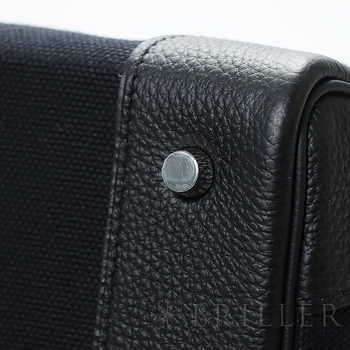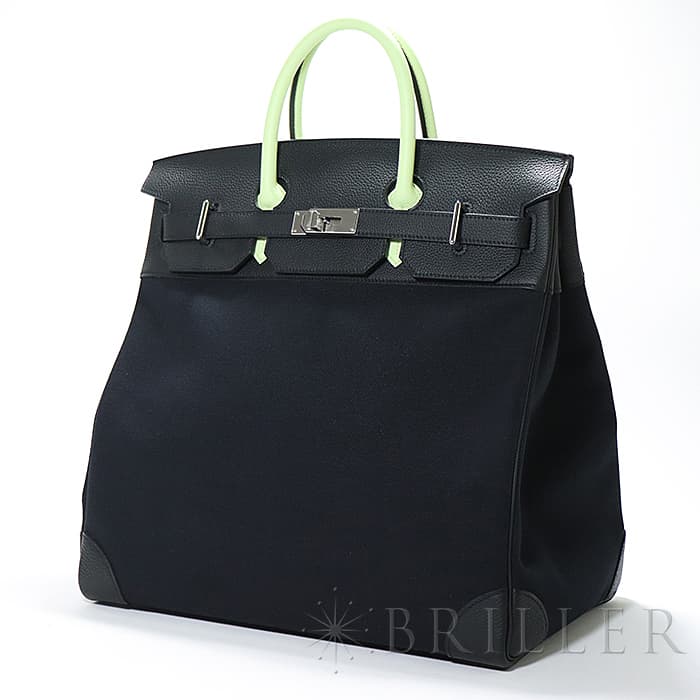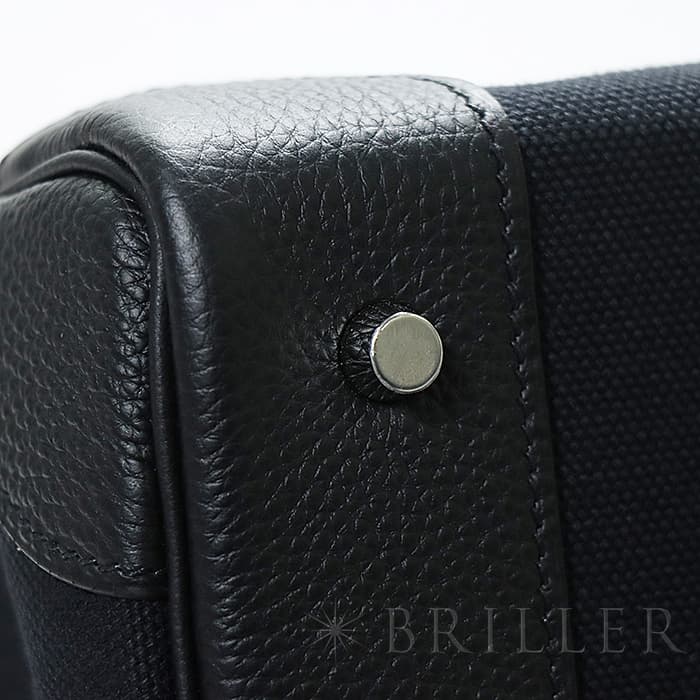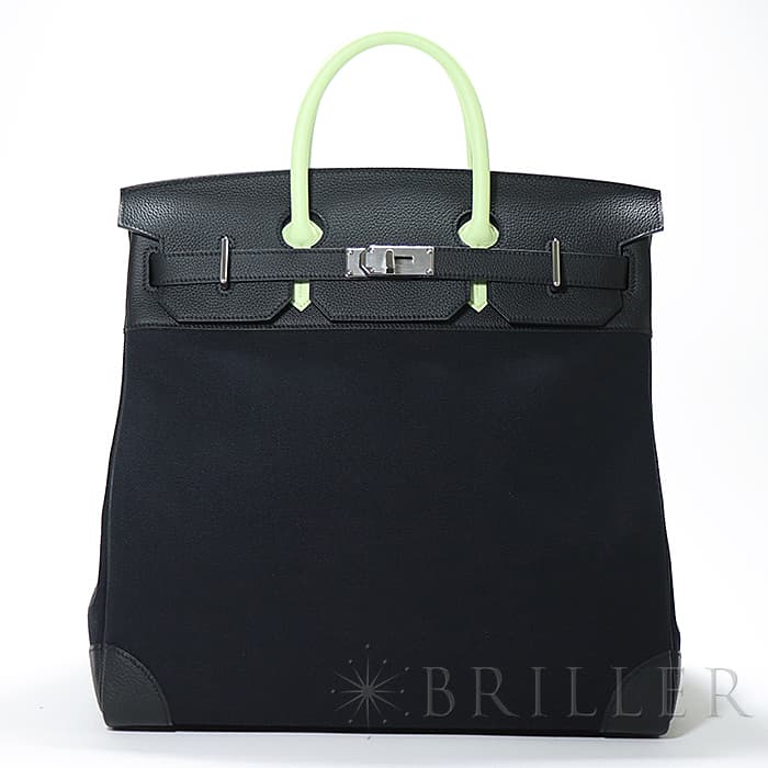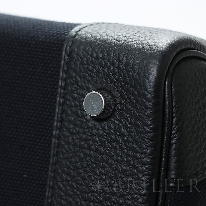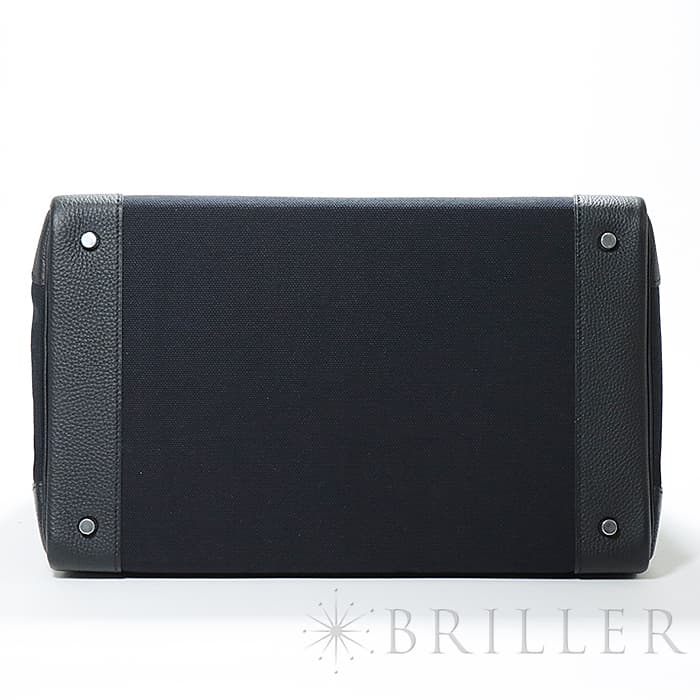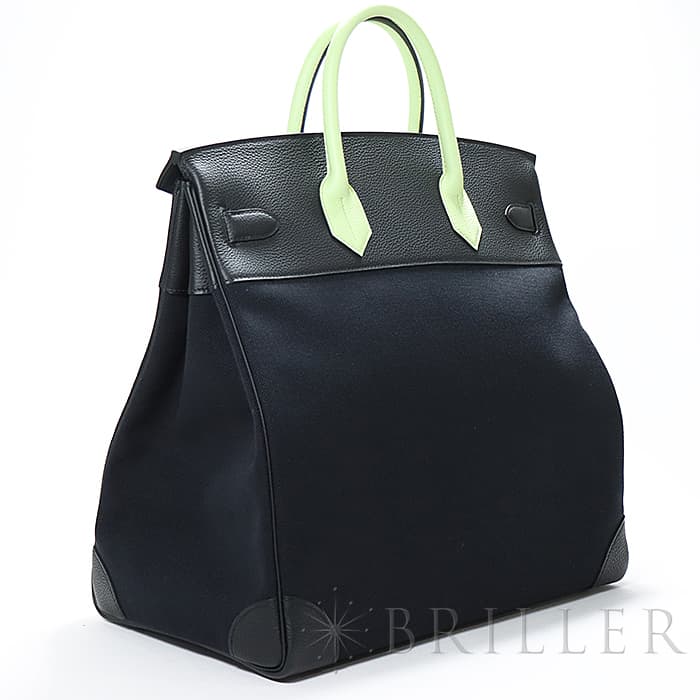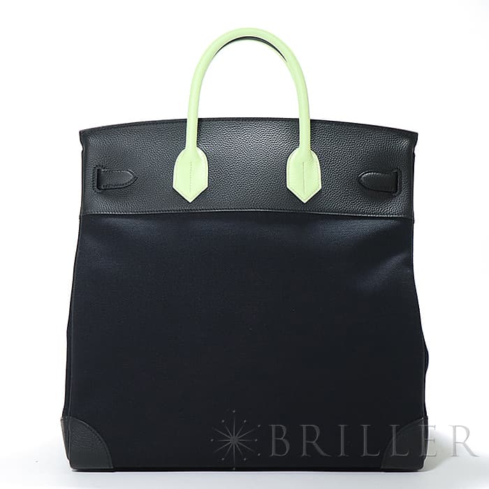 高さ"haut"とストラップ"courroies"から名づけれらた"オータクロア"という名前の通り、鞍や乗馬ブーツを運べるほどの収納力があり、その後旅行用バッグとして変化をしていったエルメスを象徴するようなバッグです。 ブラックカラーのコットンキャンバス素材・トワルアッシュにジョーヌ ブルジェオンの差し色がメンズライクな印象を演出。実際に手にしてみますとそこまで重くないため、女性の旅行バッグとしても男性のビジネスバッグとしてもおすすめです。U刻印(2022年製)の未使用状態の品物です。