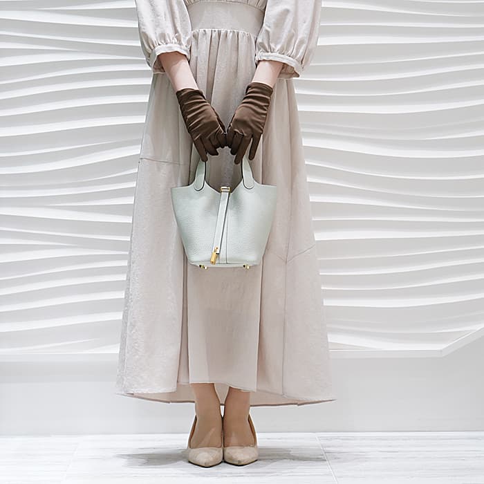2003年発表の「ピコタン」。元々は荷物を運ぶ牛馬用の飼料を入れる袋からイメージされたバッグです。“ピコタン”とは木で作られたボワソーという穀物の量を測る入れ物で重さを計測する「単位」のことです。ピコタンの中でも一番小さく人気サイズ「PMサイズ」は、ちょっとしたお出かけにもぴったりです。 2023年春夏の最新色「グリネヴェ」はグリーンのニュアンスが軽やかで知的な印象を与えるグレーカラーです。フェミニンなコーディネートにはもちろん、カジュアルなファッションにも合う新しい万能カラーをぜひご検討ください。U刻印(2022年)未使用品のお品物です。