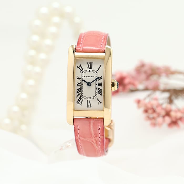 洗練されたコレクションとして、カルティエのレディースモデルモデルの中でも高い人気を誇る「タンク アメリカン」。女性らしい、緩やかなカーブを描いたスクウェアのケースにはイエローゴールドを使用しており、カルティエの名にふさわしい高級感がございます。ホワイトダイヤルに2針と、シンプルなダイヤルデザインとなっているため、華やかながら、落ち着いた気品を兼ね備えているのも嬉しいポイント。搭載ムーブメントにはクォーツを採用し、普段使いしやすい時計です。