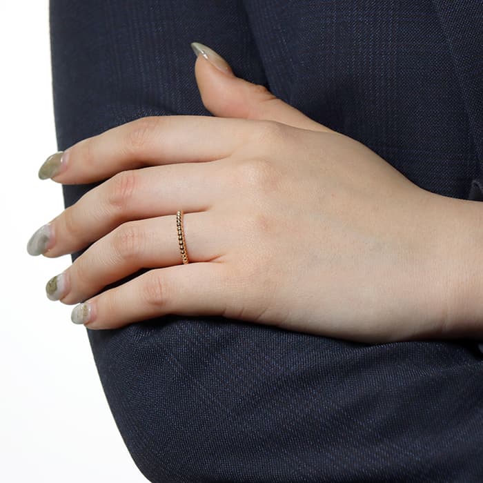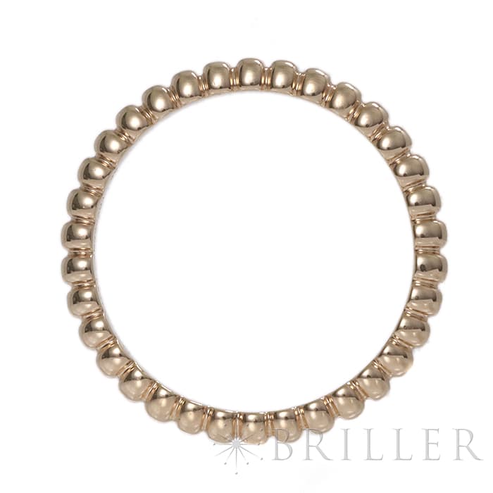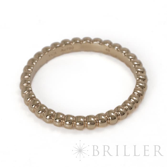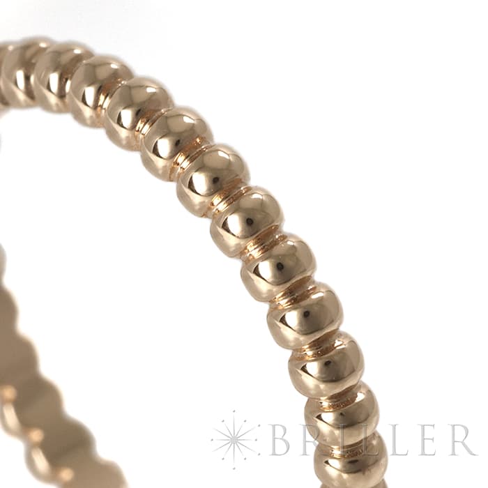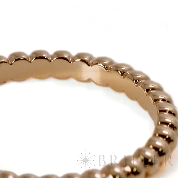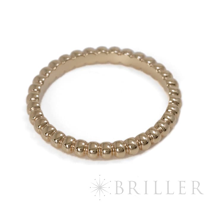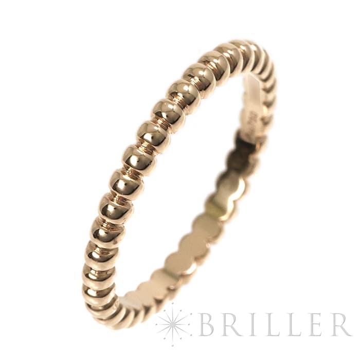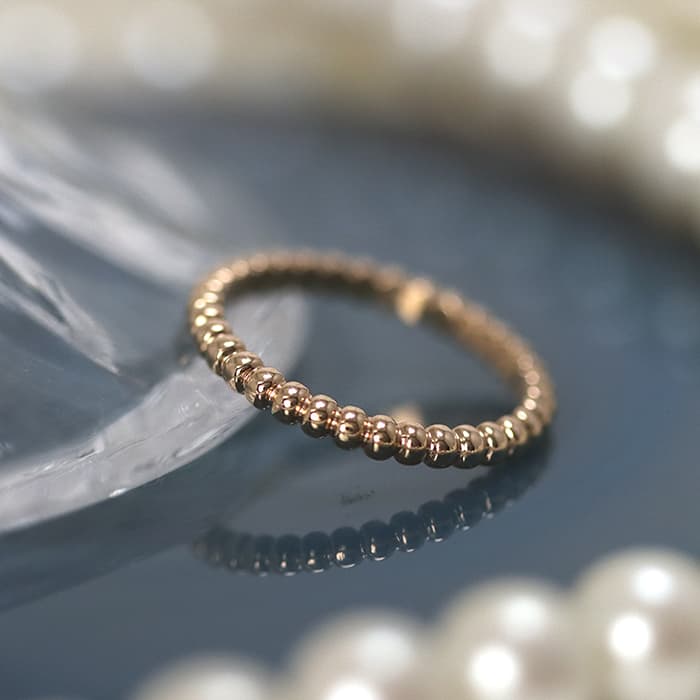 フランス語で真珠を意味する「ペルレ」。繊細なゴールドビーズがフェミニンな印象を演出する、ヴァンクリーフ&アーペルの技術の粋を集めたジュエリーコレクションです。温かみのある色合いのピンクゴールドは肌なじみがよく、他のリングと重ねても邪魔することなく調和するデザインはマルチに活躍し、装いの幅が広がりそうです。