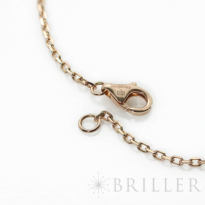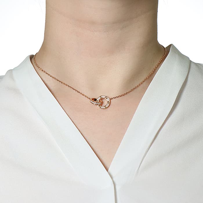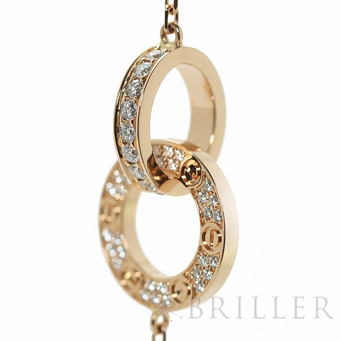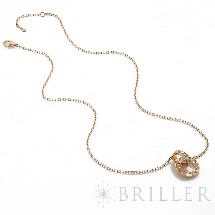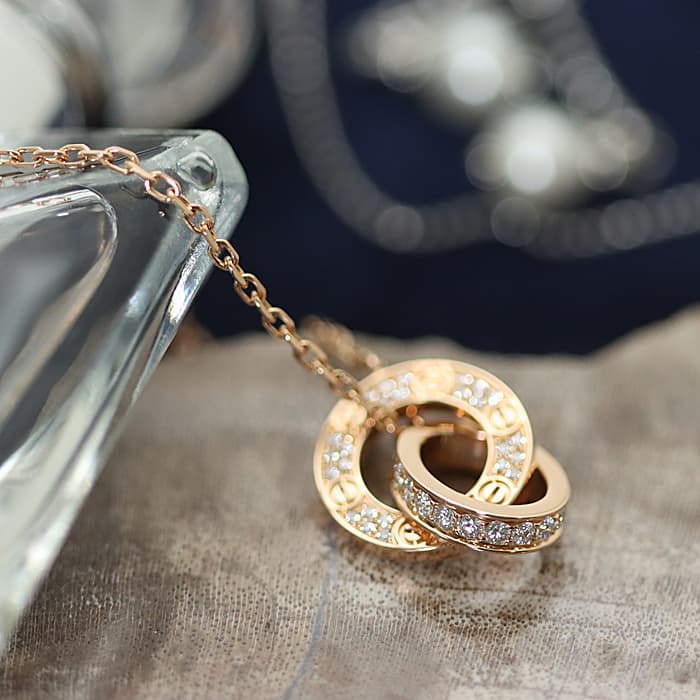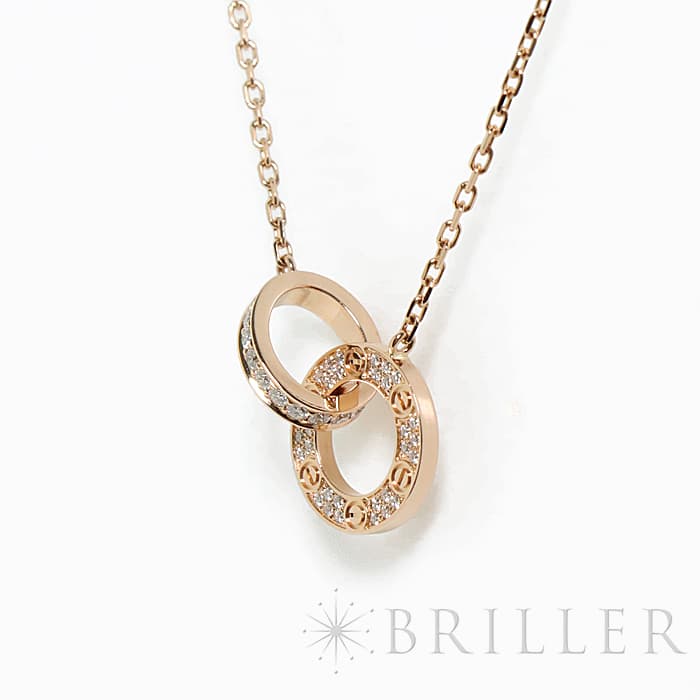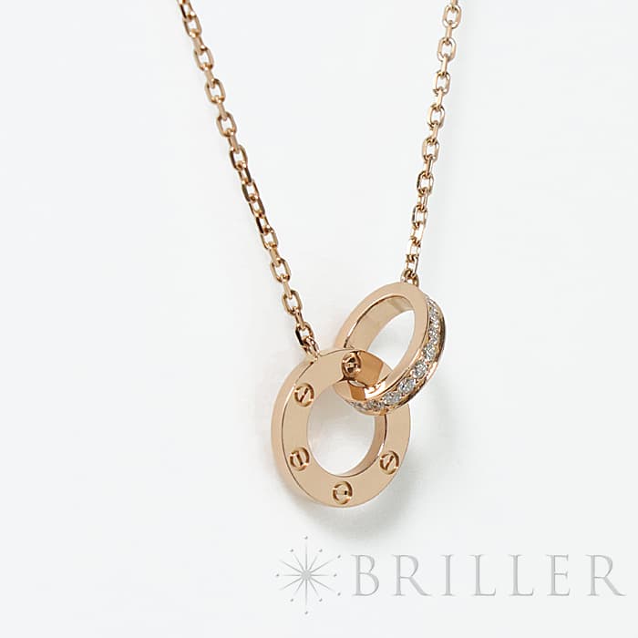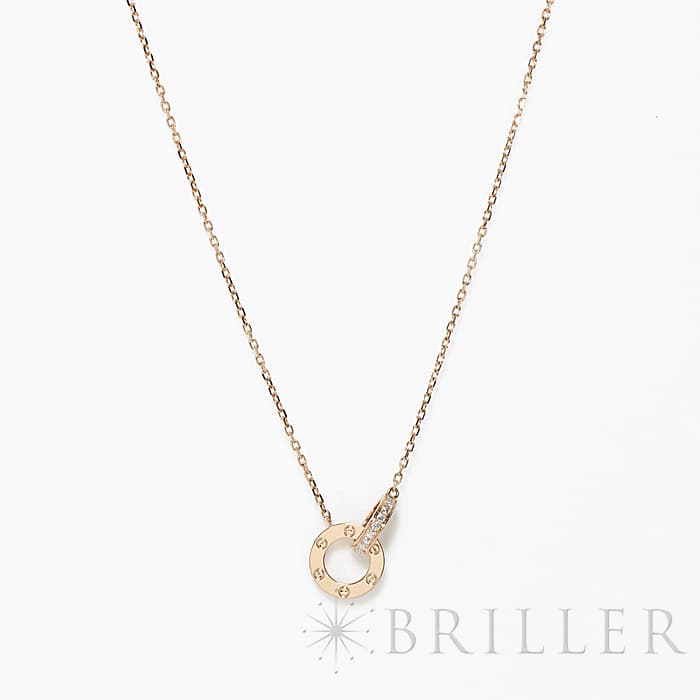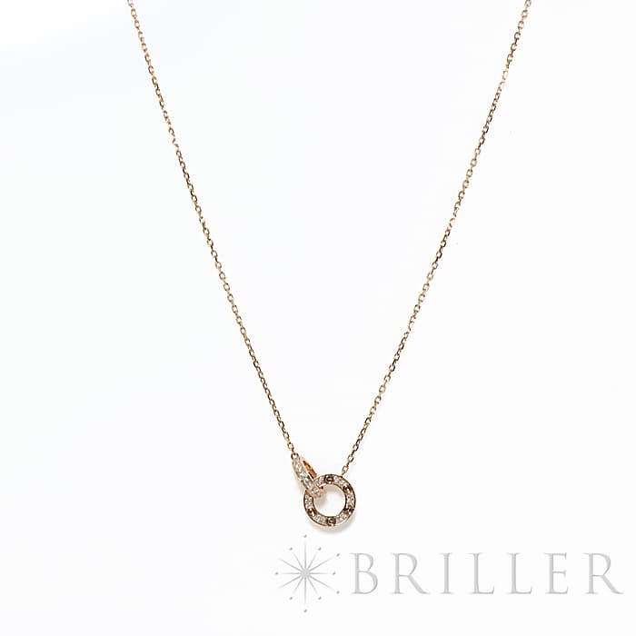 世界5大ジュエラーとして世界中から愛されるブランド「カルティエ」。カルティエが手掛ける「束縛」や「愛の絆」をテーマにして作られた「ラブコレクション」は、老若男女問わず不動の人気を博しています。2つのモチーフが合わさり繋がりの強さを感じさせるこちらのネックレスは、まさにラブコレクションらしいデザインです。肌なじみの良いピンクゴールドにダイヤモンドがセッティングされており、首元を華やかに彩ります。