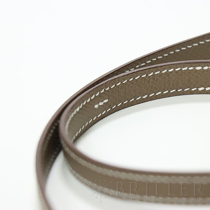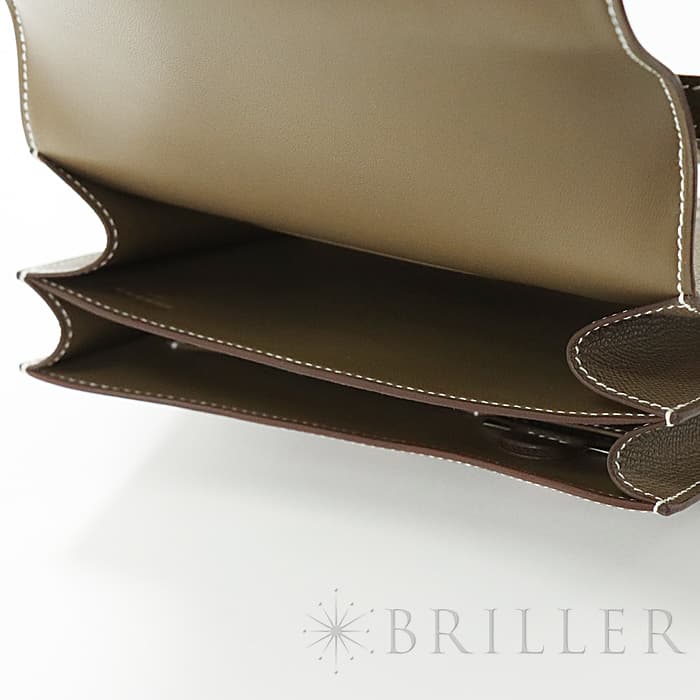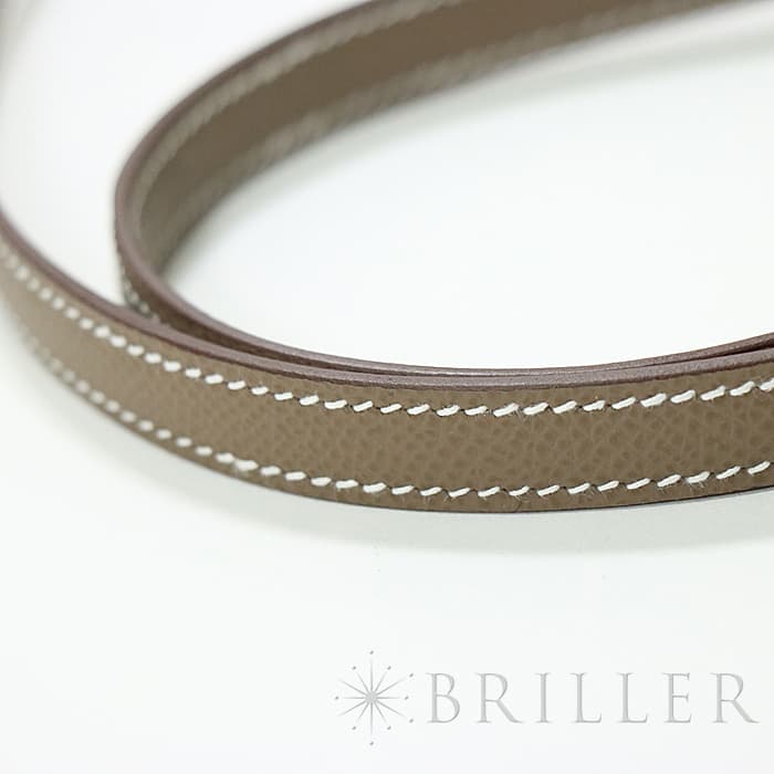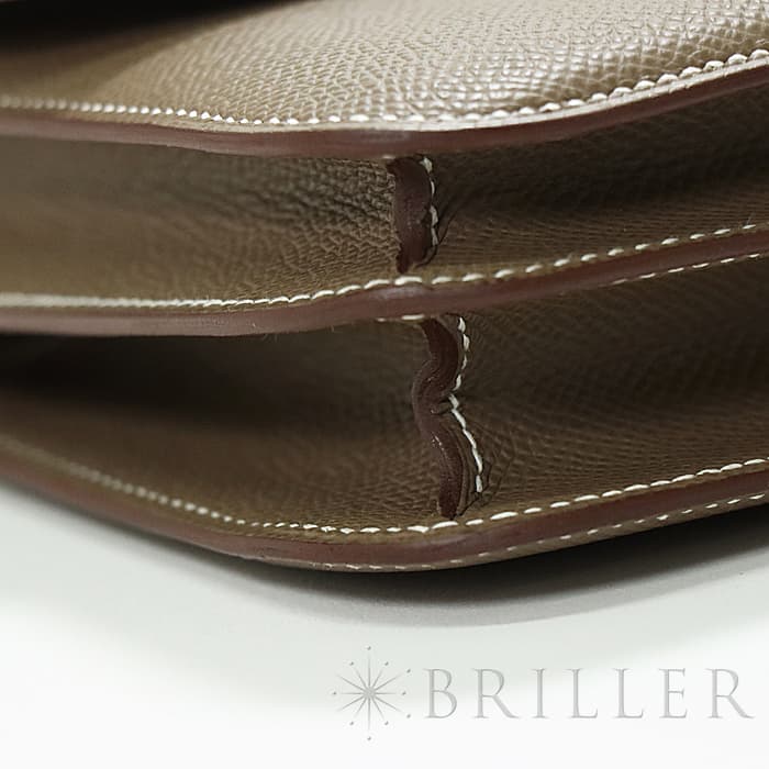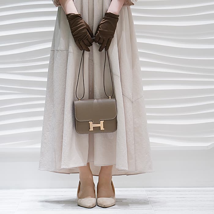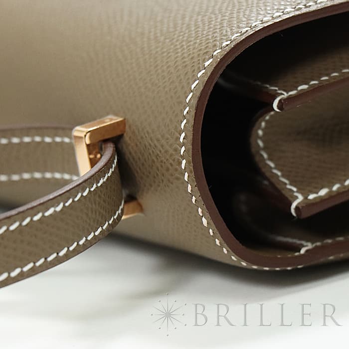 小ぶりのコロンとしたフォルムが可愛らしいコンスタンス3 ミニ。こちらのお品物は新型となっており、オープンポケットが2つから3つへ増加しているほか、付属品にミラーが付いています。お色味はエルメスの定番グレージュ「エトゥープ」となっており、ピンクゴールド金具との組み合わせが上品なアイテムです。ショルダーを1連にして斜め掛けにもできるサイズ感で、エレガントに使いたい時は2連にして小脇に抱えればドレスアップしたスタイルにもマッチします。U刻印(2022年)で、金具にシールも残った未使用状態のお品物です。