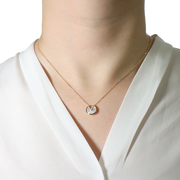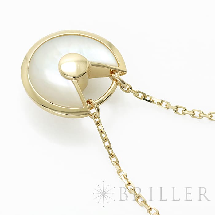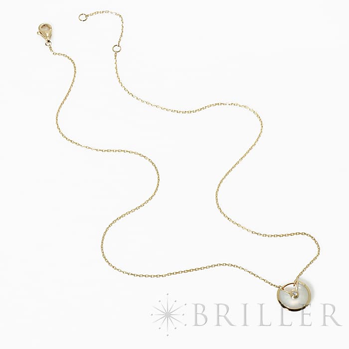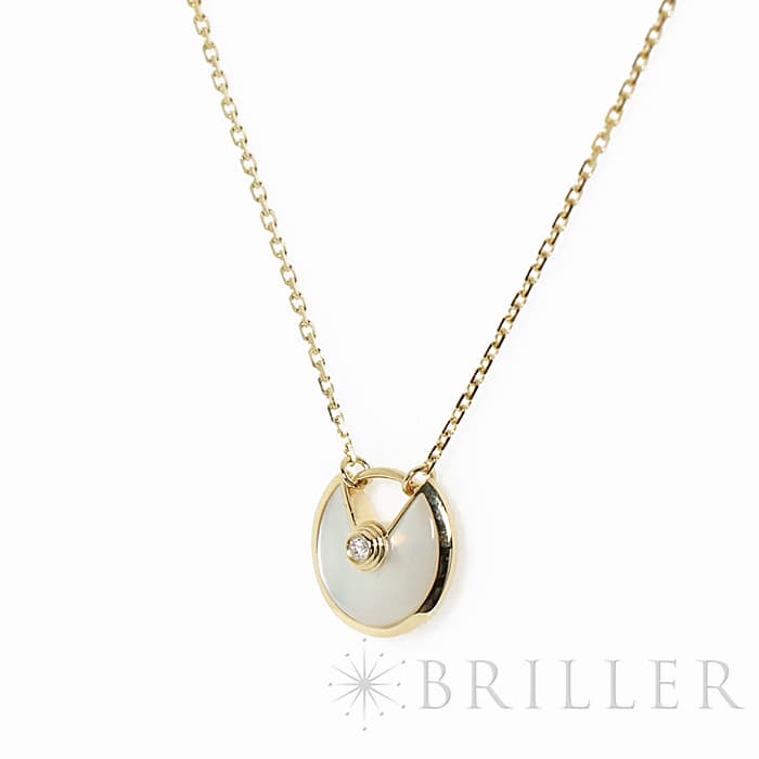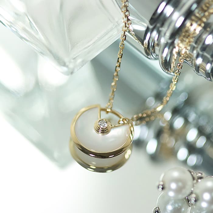 世界5大ジュエラーとして世界中で人気を誇る宝飾ブランド「カルティエ」。数多くの洗練された個性的なジュエリーは多くの女性から愛されています。カルティエが展開するシリーズの中でも人気のシリーズが「アミュレット ドゥ カルティエ」です。「心に秘めた願いの開放」をテーマにして作られており、シンプルながらも上品なデザインが特徴です。華やかなイエローゴールドに魅惑的な輝きを秘めるホワイトマザーオブパールが使用されたこちらのネックレスは、小ぶりながらも首元で上品に輝きます。