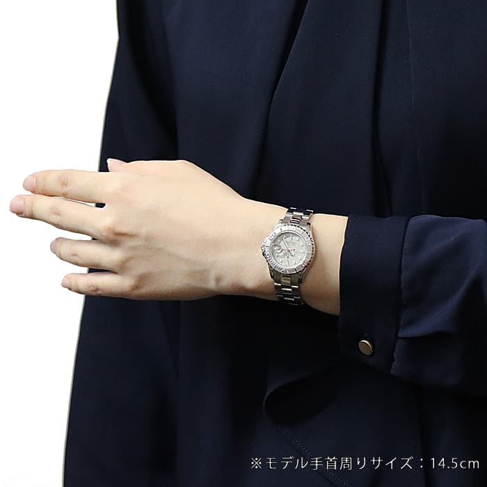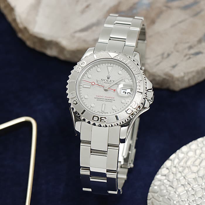 1999年~2014年頃まで生産されていたヨットマスターのレディースモデル。ベゼルと文字盤にプラチナを使用し、ステンレスと組み合わされた”ロレジウム”(ROLEXによる造語) ムーブメントにはデイトジャストなどにも採用されているCal.2235を搭載しています。 スポーティな印象ですが、全体的に同系色で纏められていますので、 デイリーにはもちろん、ビジネスシーンでも活躍しそうな1本です。