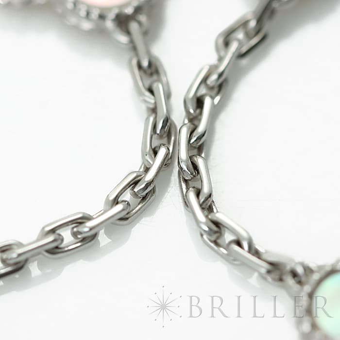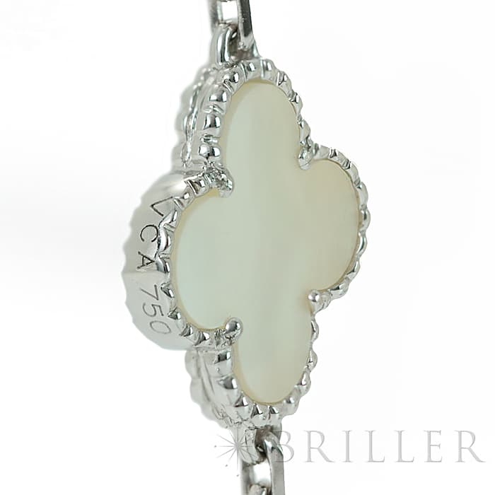 ヴァン クリーフ&アーペルの中でも常に高い人気を誇る「アルハンブラ」コレクション。 「VCARF48500」は、幸運のシンボルである四つ葉のクローバーのモチーフが10個も連なり、一目でヴァンクリーフ&アーペルとわかるアイコニックなネックレスです。 ホワイトゴールドを贅沢に使用し、ホワイトシェルをあしらったモチーフは、光によって美しく表情を変化させ、上品な輝きを放ちます。