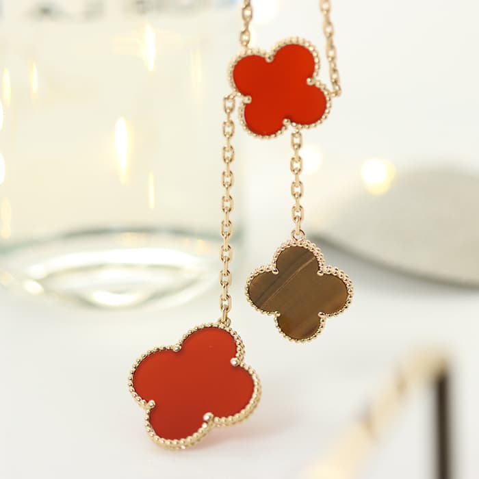 ヴァン クリーフ&アーペルの中でも常に高い人気を誇るアルハンブラ。レッドやオレンジに輝くパワーストーン「カーネリアン」とブラウンカラーの縞模様が美しい「タイガーズアイ」を使用したクローバーモチーフが連なる、遊び心あるアシンメトリーなデザインが魅力のこちらのネックレスは、身に着けるだけで気分があがること間違いなしの素敵なジュエリーです。