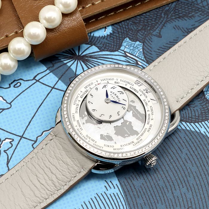 1978年、エルメス専属デザイナー アンリ・ドリニー氏が手掛け、エルメス初の腕時計として誕生したアルソー。こちらは2023年の新作で、ホワイトシェルとダイヤモンドベゼルを備えた「アルソー ル タン ヴォヤジャー」です。ムーブメントには約40時間のパワーリザーブを有する自社製「Cal.H1837」を搭載。エルメスのスカーフに用いられている「乗馬の世界地図」のデザイン上を、ローカルタイムを表示する衛星ダイヤルが巡る、ロマンティックな仕様がたまらない1本です。