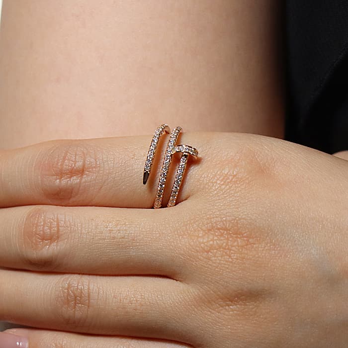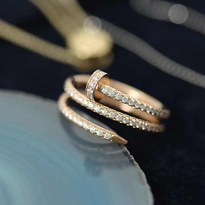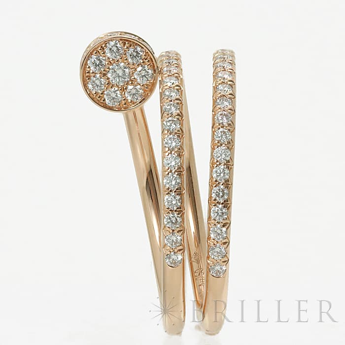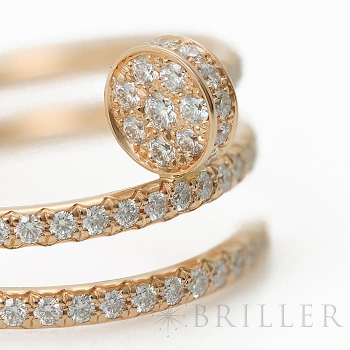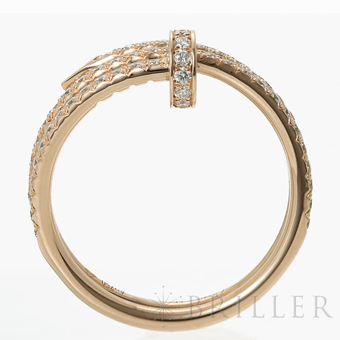 フランスで誕生し、独創的なデザインや技術力の高さから圧倒的な支持を受けるブランド「カルティエ」。フランス語で「1本の釘」を意味する「ジュスト アンクル」は、エレガントなアクセサリーの多いカルティエにおいては異色のジュエリーです。ピンクゴールド素材の「B4210900」には、77個(計0.59ct)ものブリリアントカットダイヤモンドがセッティングされており、極めて贅沢なリングに仕上がっております。