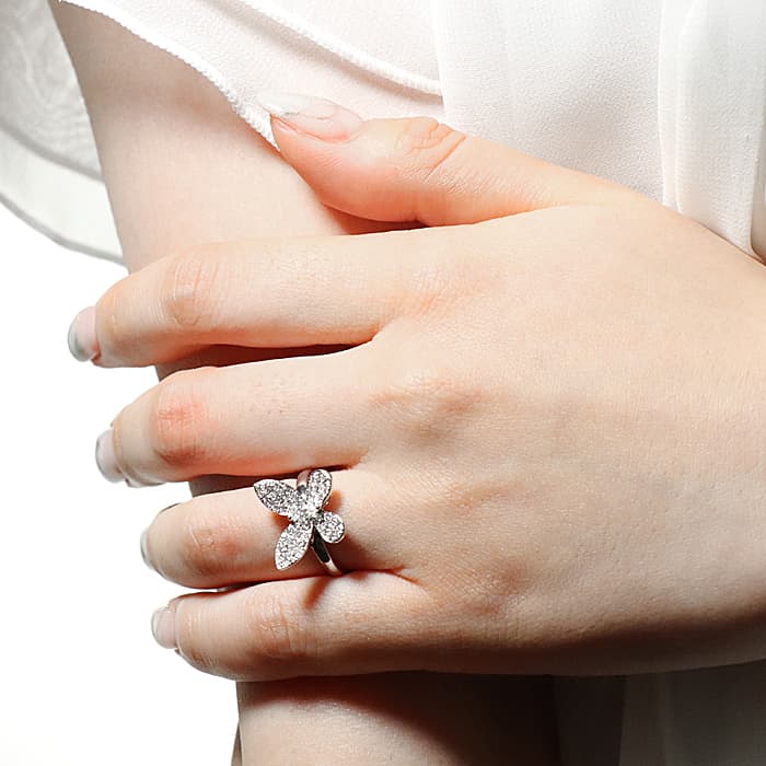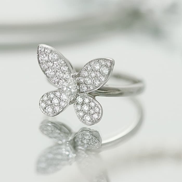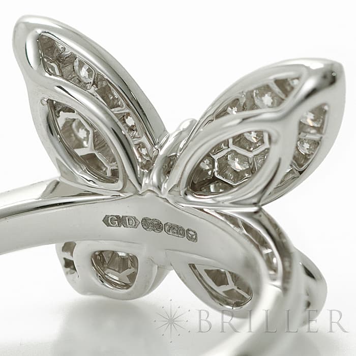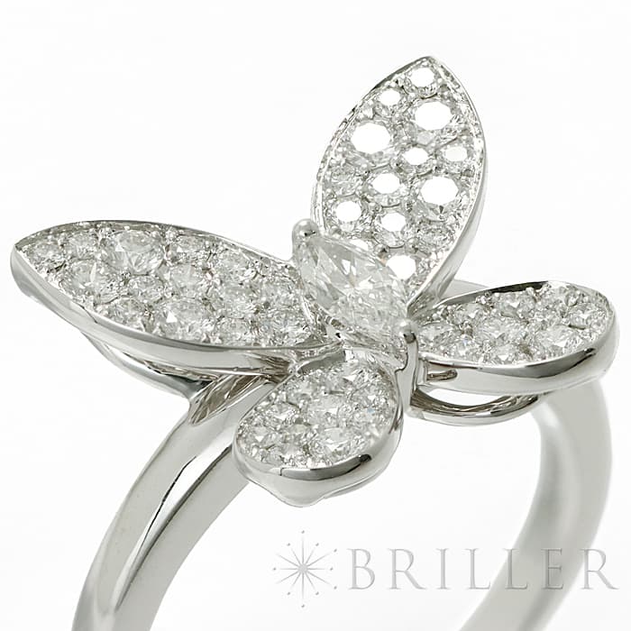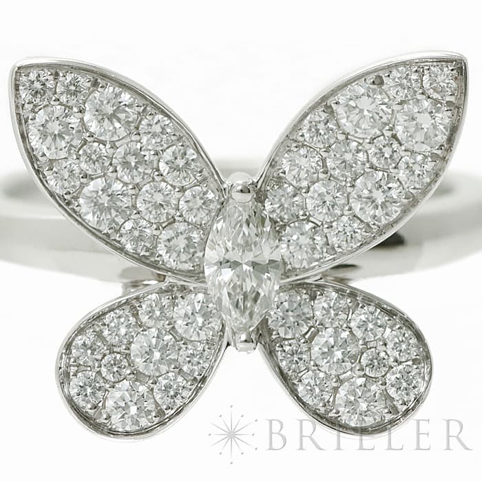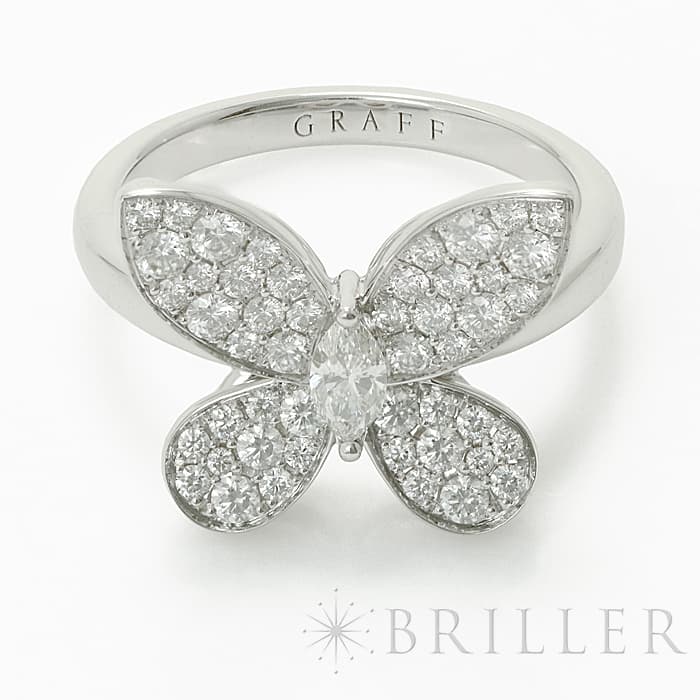 ダイヤモンドのクオリティにおいてトップレベルと評されるイギリスのジュエラー「GRAFF(グラフ)」。 バタフライコレクションはグラフのアイコニックな存在で、パヴェダイヤモンドの繊細かつ上品な美しさが印象的です。ホワイトゴールドにマーキスカット・ダイヤモンドとパヴェダイヤモンドをセッティングしたこちらのリングは、手にした方だけが楽しめる極上の輝きを放ちます。