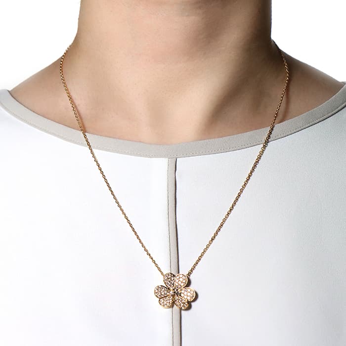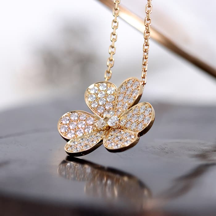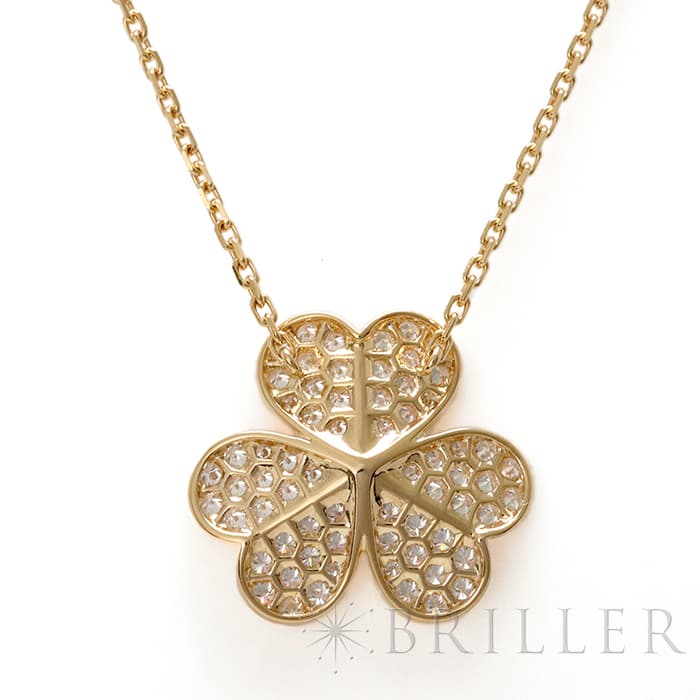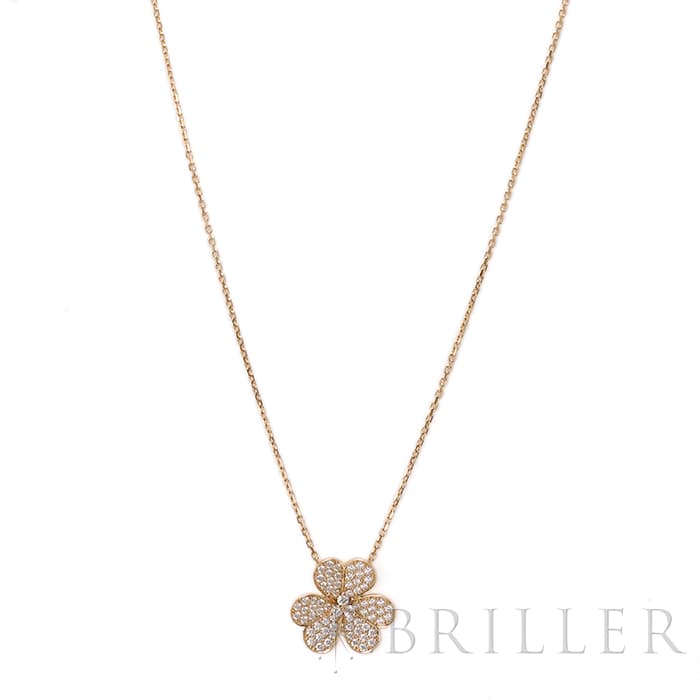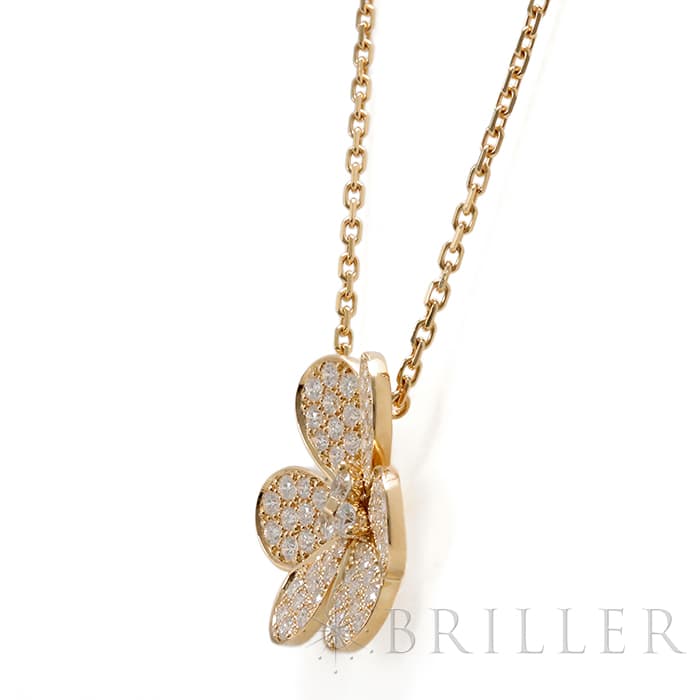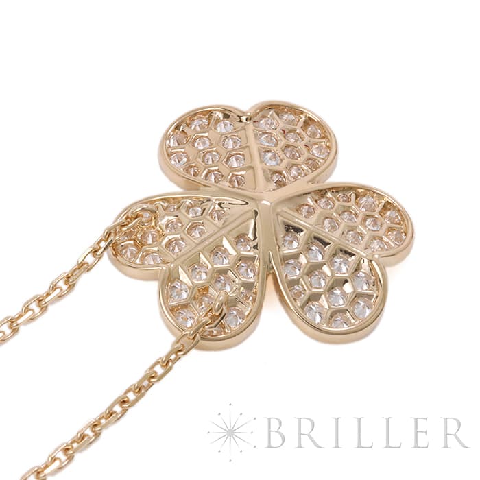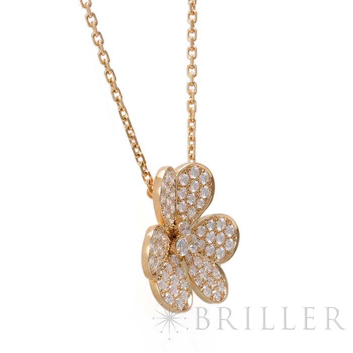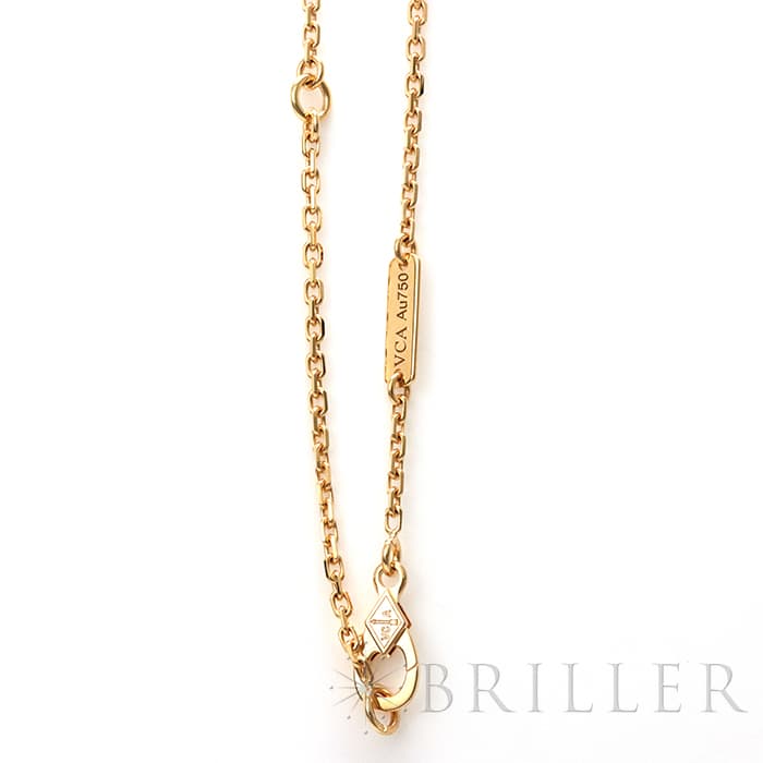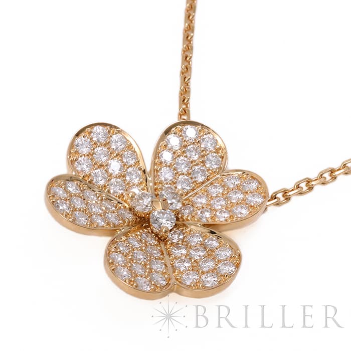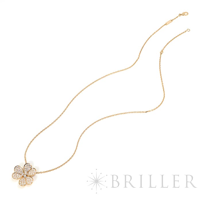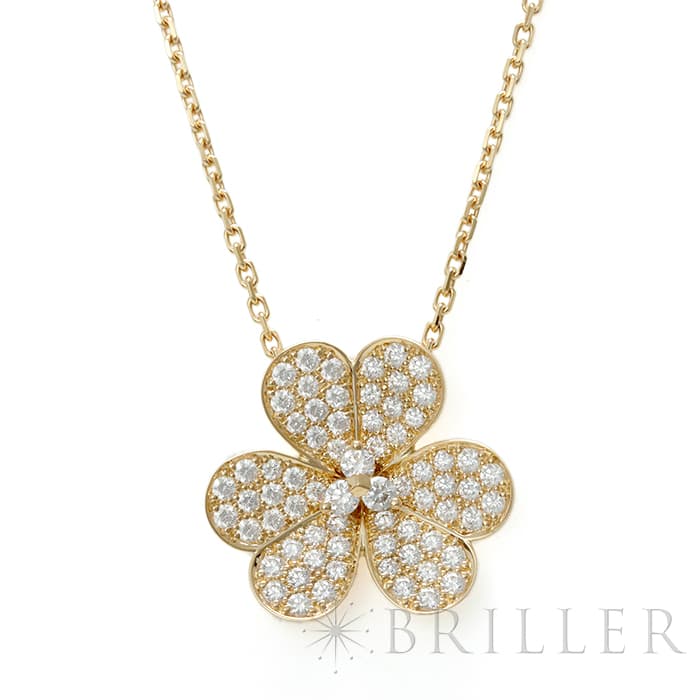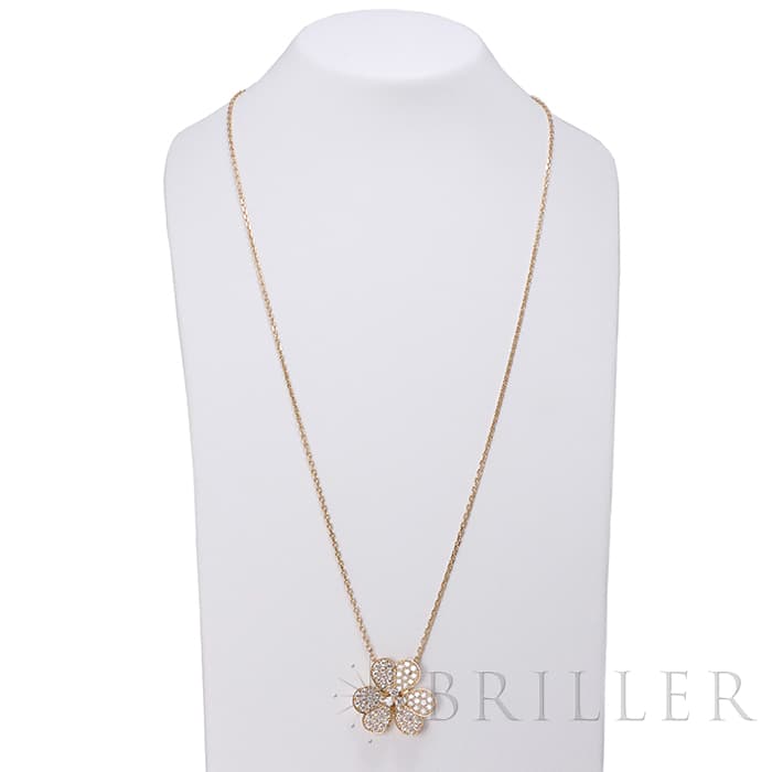 こちらのネックレスは、存在感のあるラージサイズの豪華なジュエリーです。セッティングされた69石(計約1.3ct)のダイヤモンドは、カラー「DEF」、クラリティ「IF~VVS」という高いグレードのもののみであり、ヴァンクリーフ&アーペルのハイクオリティなダイヤを堪能できるネックレスです。チェーンはアジャスターを含め、46cmの長さがあり、美しくモチーフが揺れる様子をお楽しみいただけます。