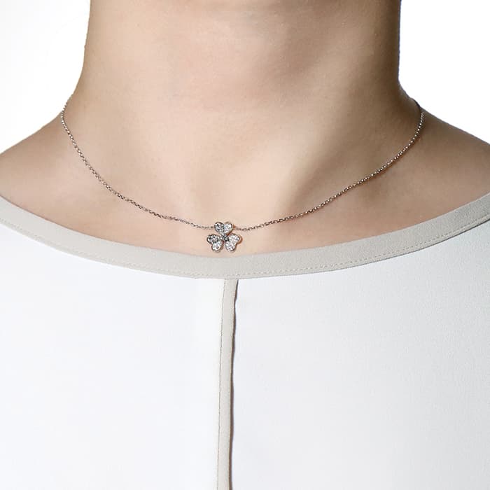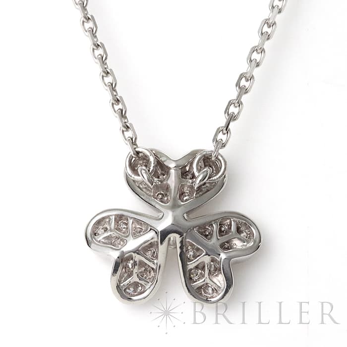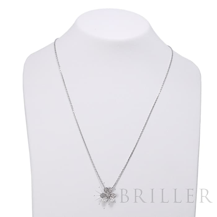 こちらのネックレスは、中央に一粒のブリリアントカットダイヤモンド、花びらにパヴェダイヤモンドがセッティングされており、小振りながら贅沢なジュエリーです。