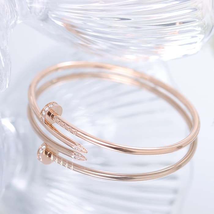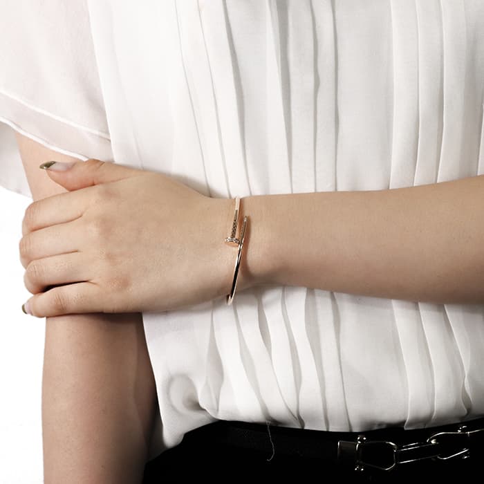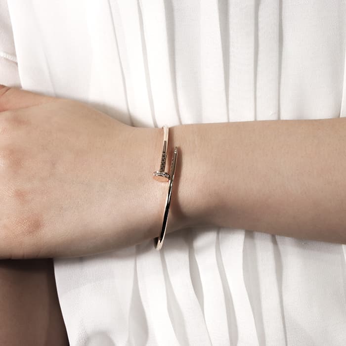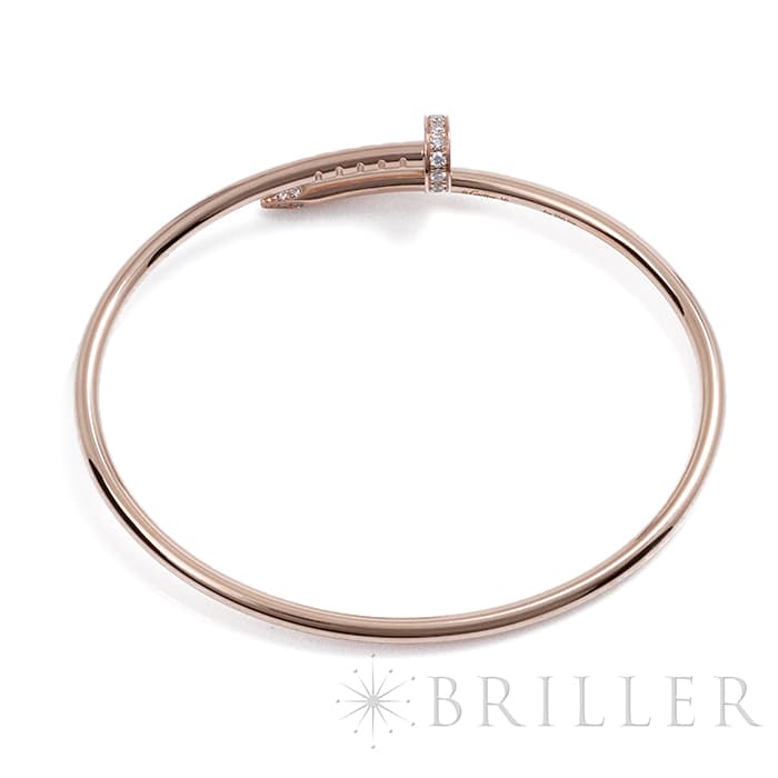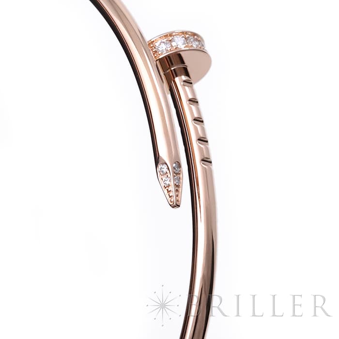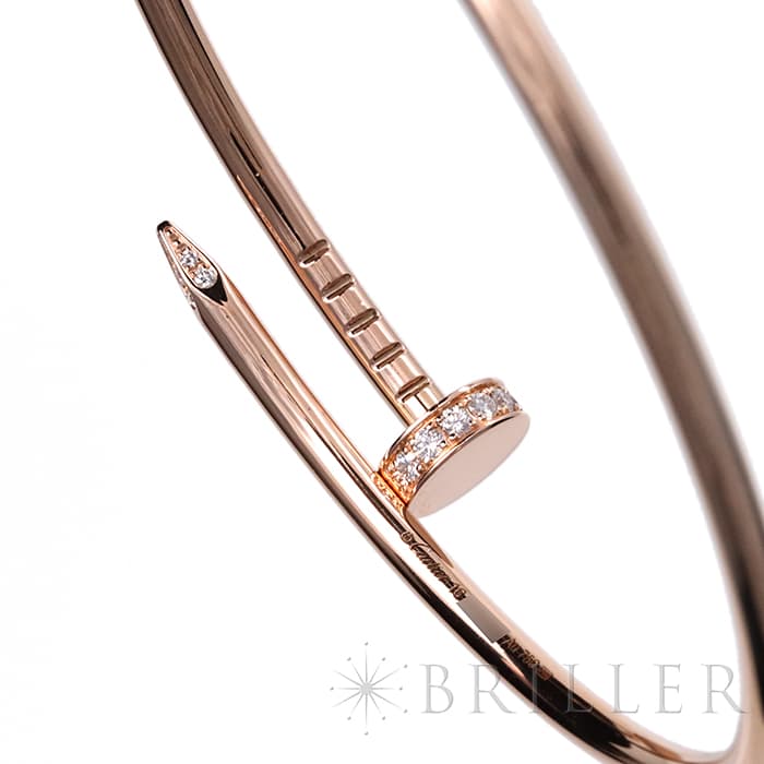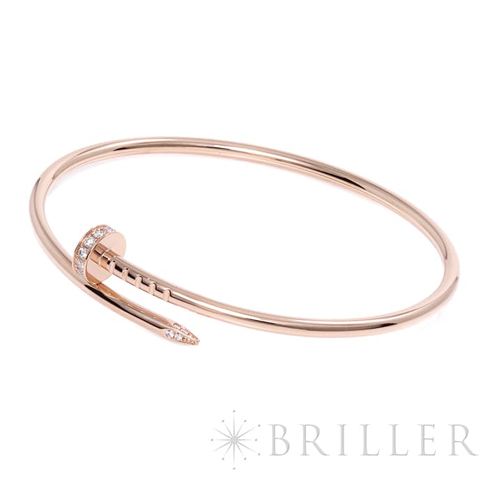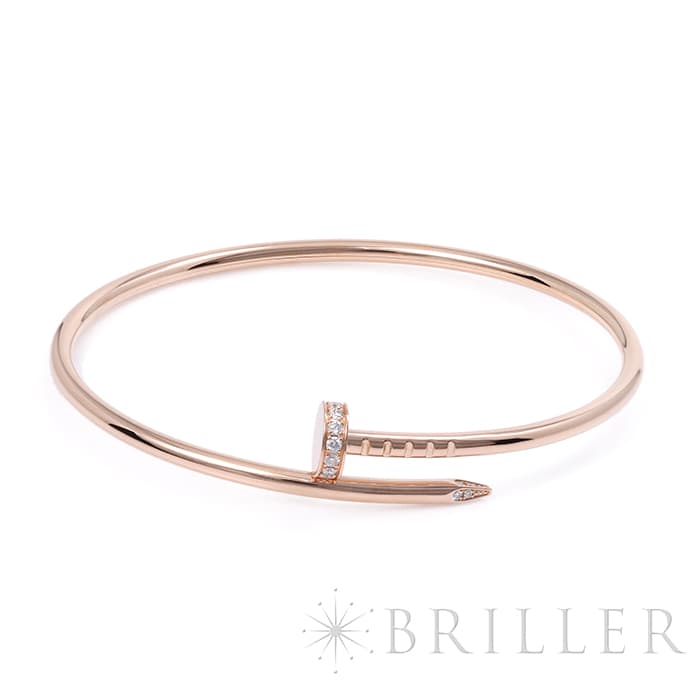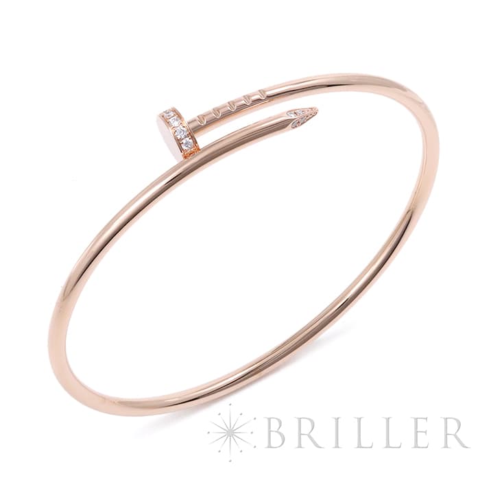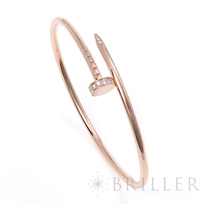フランスで誕生し、独創的なデザインや技術力の高さから圧倒的な支持を受けるブランド『カルティエ』。「1本の釘」という意味を持つコレクション『ジュスト アン クル』が入荷いたしました。大胆かつモダンなデザインのピンクゴールドブレスレットは、適度な力強さと美しさを兼ね揃えています。ヘッドの周りにダイヤモンドが輝き、シンプルでありながらエレガントな装いにも映える一品です。