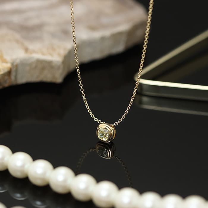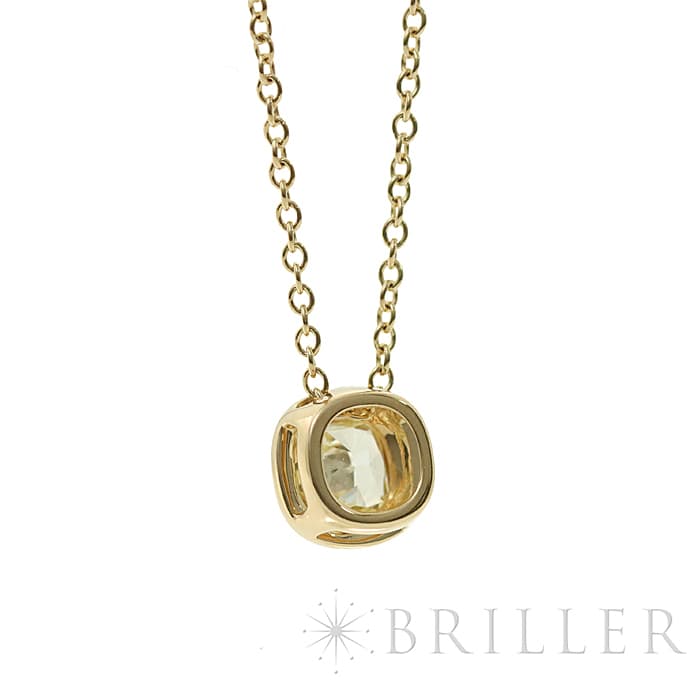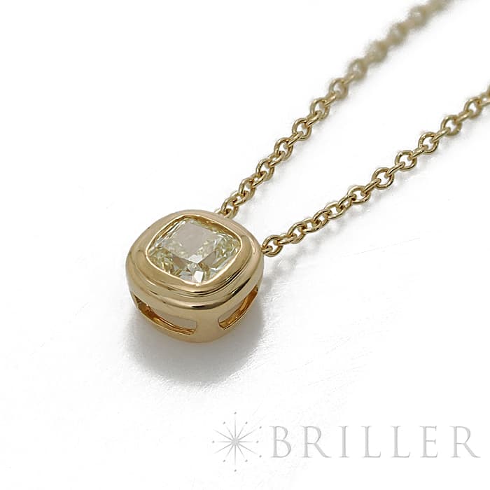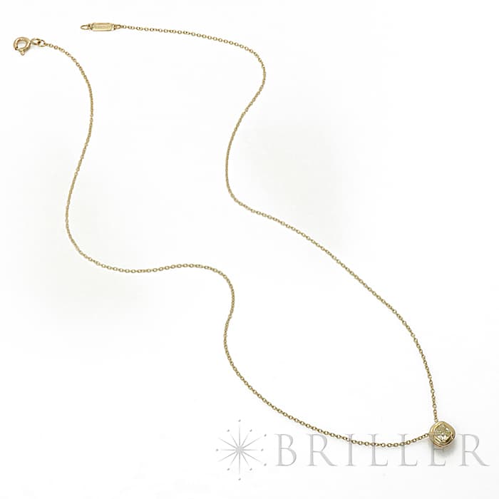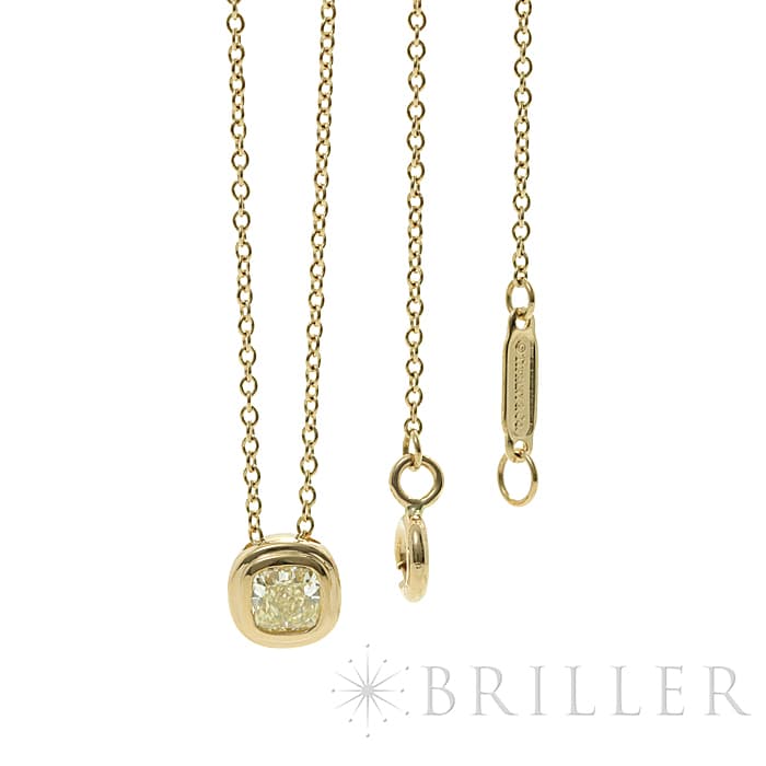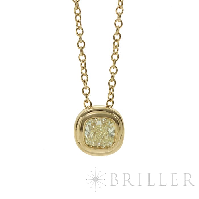 世界5大ジュエラーの1つであるティファニーは、鮮やかなティファニーブルーと呼ばれるブランドカラーで、ジュエリー好きでなくても知らない人がいないほどの知名度を誇るアメリカのブランドです。クッションカットのファンシーイエロー ダイヤモンドを18Kゴールドのベゼルにセッティングしたペンダントは太陽のごとくピュアな光を放ちます。