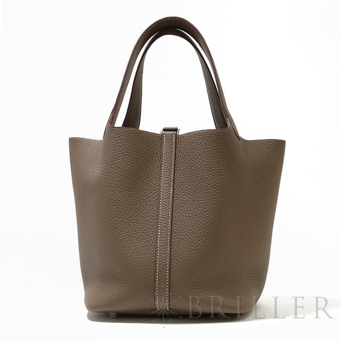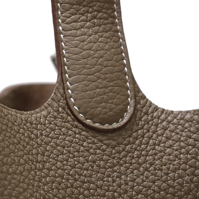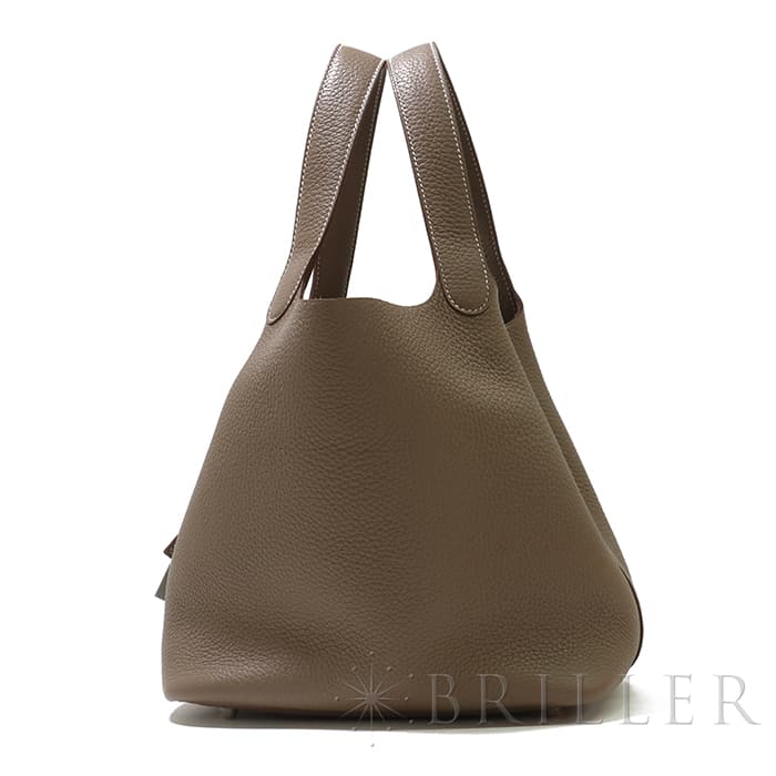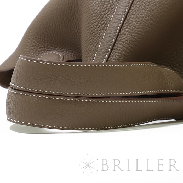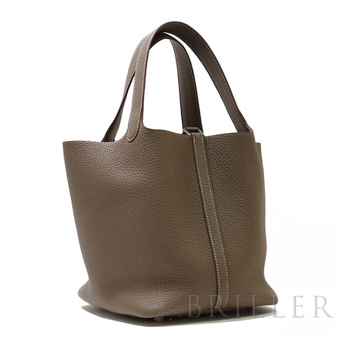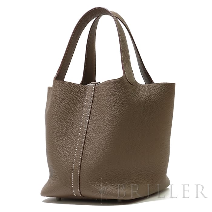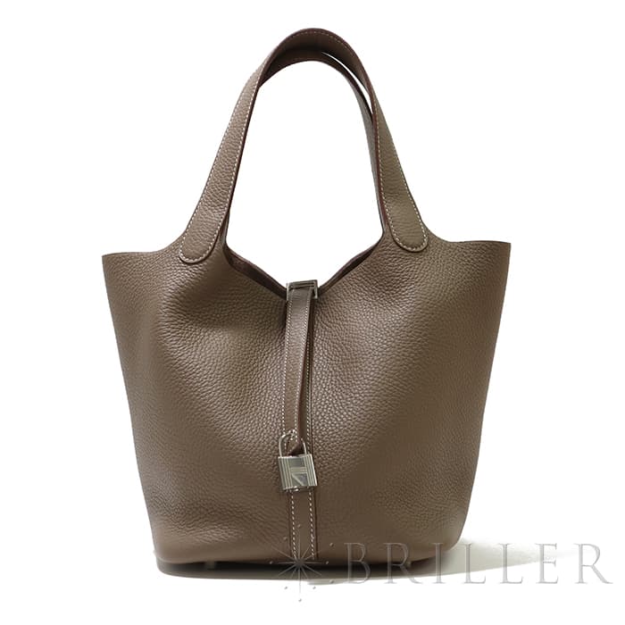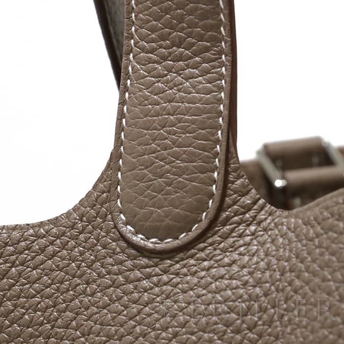 牛馬用の飼料を入れるカゴから着想を得て、2003年に誕生した「ピコタン」。 中世フランスで使われていた穀物量を測る単位から名付けられ、「ピコタン ロック」には、エルメスを象徴するカデナが取り付けられています。 グレージュカラーの「エトゥープ」は、どのような装いにもマッチする色味で、 上質な柔軟性と高い耐久性を誇る「トリヨンクレマンス」は、長くご愛用頂くのにぴったりな素材です。