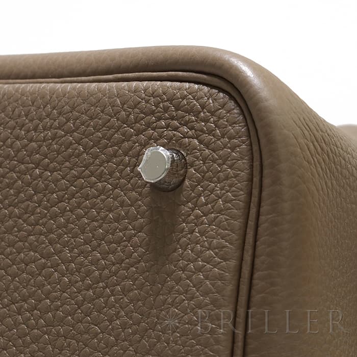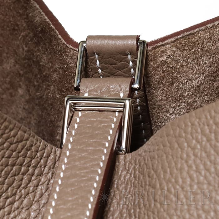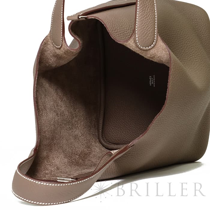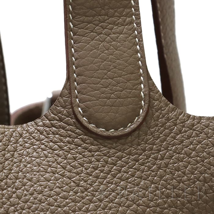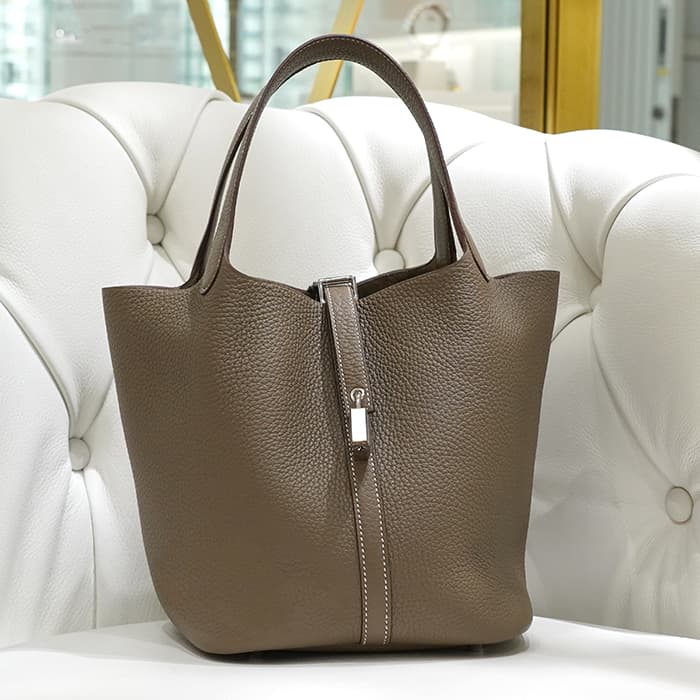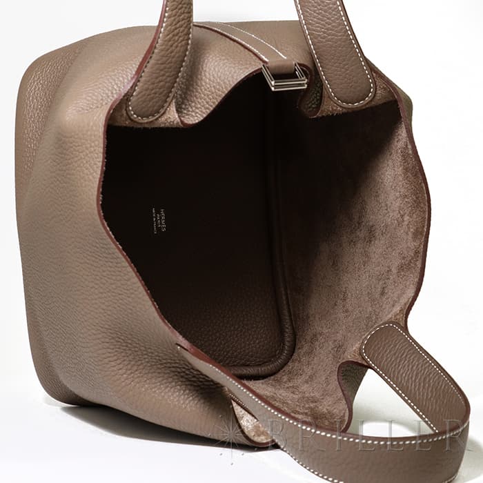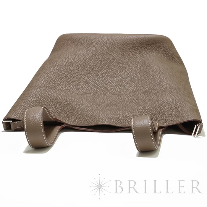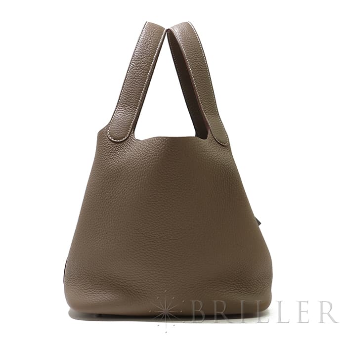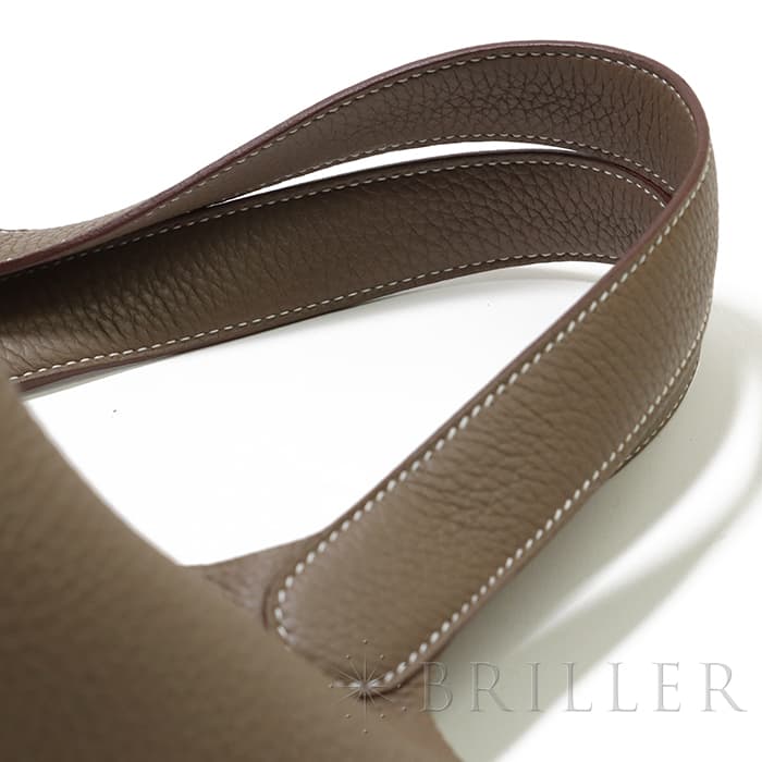 牛馬用の飼料を入れるカゴから着想を得て、2003年に誕生した「ピコタン」。 中世フランスで使われていた穀物量を測る単位から名付けられ、「ピコタン ロック」には、エルメスを象徴するカデナが取り付けられています。 グレージュカラーの「エトゥープ」は、どのような装いにもマッチする色味で、 上質な柔軟性と高い耐久性を誇る「トリヨンクレマンス」は、長くご愛用頂くのにぴったりな素材です。