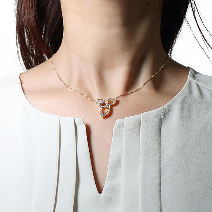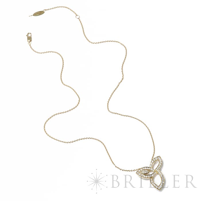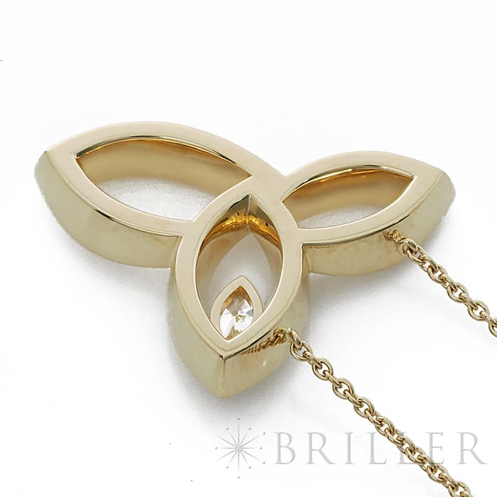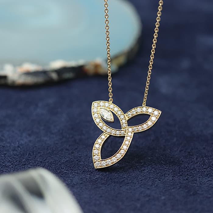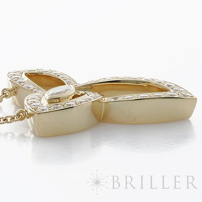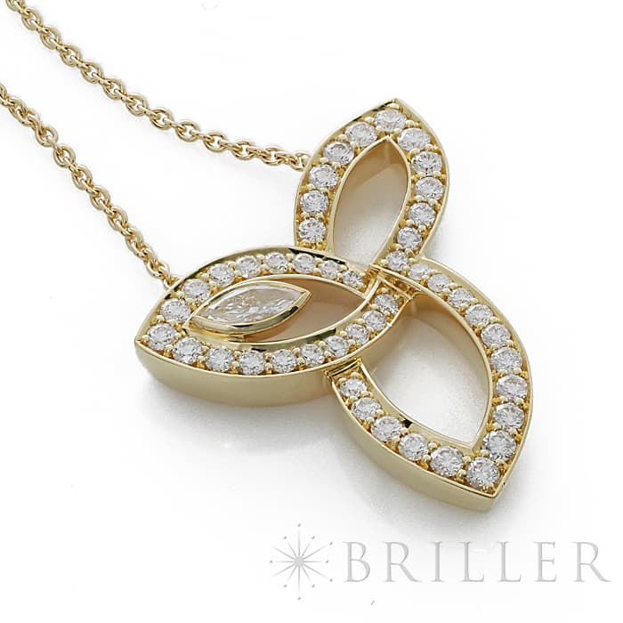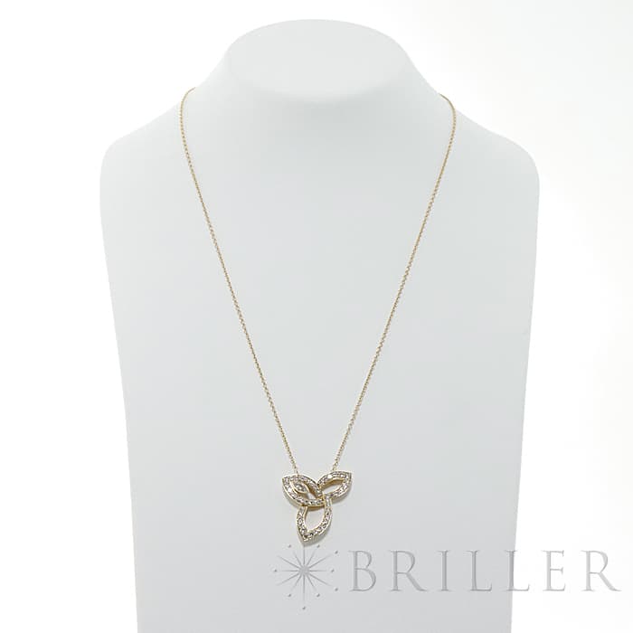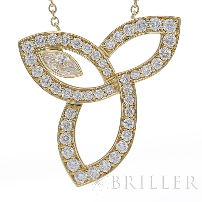こちらのネックレスは、イエローゴールド素材のモチーフに、1個のマーキースカットダイヤモンドと、45個のラウンドカットダイヤモンドがあしらわれています。 その合計は約0.68ctにも及び、世界最高峰のジュエラーとして名を馳せるハリーウィンストンの高品質なダイヤモンドを存分に堪能していただける、贅沢なジュエリーです。